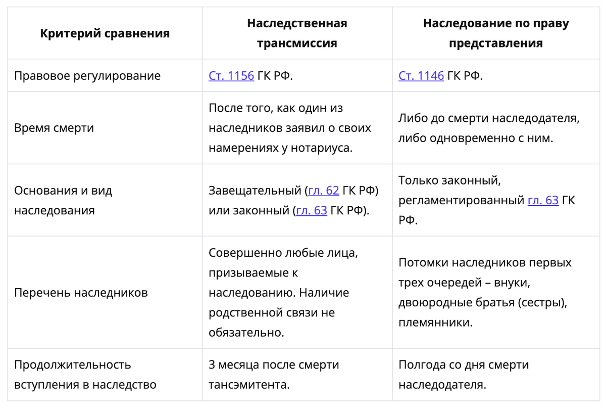 В РФ существует два похожих института – трансмиссия и право представления. Несмотря на внешнее сходство рассматриваемых явлений, есть и ряд отличий, которые необходимо понимать и принимать во внимание. Для удобства отличия представлены в форме таблицы.