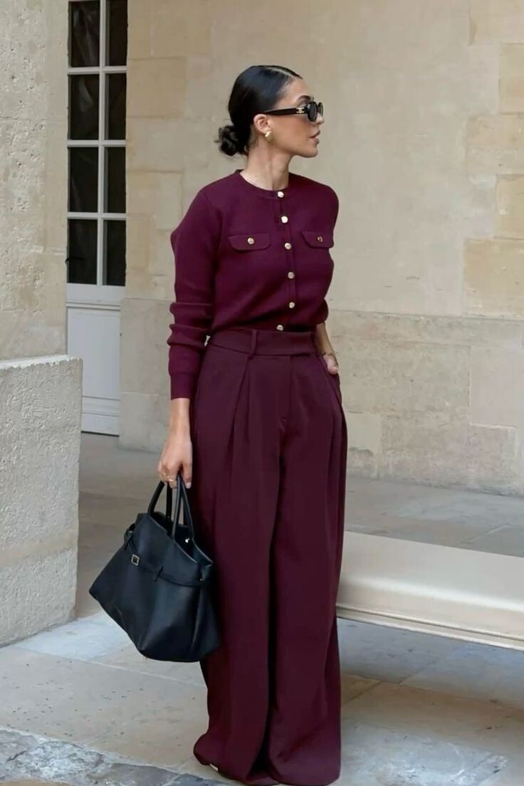 Бордовый цвет можно назваться самодостаточным, поэтому монохромный образ с ним будет смотреться на зрелой даме смело и эффектно, но гарантированно привлекательно. Хороший пример такого образа – широкие брюки классического кроя с защипами и обеспеченной широким поясом высокой посадкой, надетые вместе с тонким трикотажным кардиганом чуть более яркого оттенка. Небольшая разница в оттенках верха и низа создает легкий эффект контраста, а крупные блестящие пуговицы на кардигане привлекают к нему внимание, тем самым визуально уравновешивая силуэт.