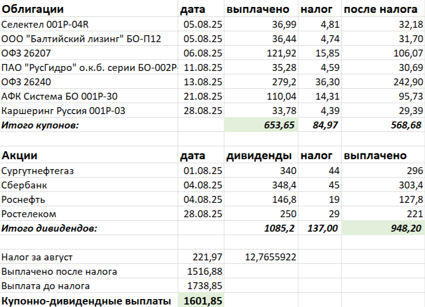 Всех с первым днем осени! В последних числах августа моему портфелю исполнилось два года. И при подведении итогов месяца, я впервые удивилась, причем приятно. Я считаю все поступления на брокерский счет за календарный месяц. Если дивидендная отсечка была в прошлом месяце, а дивиденды пришли в этом, считаю в выплаты текущего месяца. Как и то, что может прийти в следующем, будет засчитано уже там. Кроме того, я считаю доходом те деньги, которые пришли мне на счет: купоны приходят до налога, а дивиденды после. В таблицу пишу все значения: Суммы выплат в каждом разделе выделила зеленым. 1601,85 рубль купонно-дивидендного дохода! Я ожидала раза в 2 меньше. Традиционно сравниваю результат с августом прошлого года. Там я получила всего 142,49 рубля купонами и дивидендами. Неожиданная разница на порядок. Возможно, это связано с дивидендами в начале месяца. Напомню, весь 2025 год я подводила итоги купонно-дивидендных выплат: Январь Февраль Март Апрель Май Июнь Июль Свежие отчеты подавляющего б
