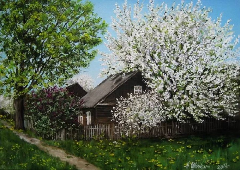 Сцена 10. Черемуха Ржавое железное кольцо в огромной, пахнущей смолой двери поддалось не сразу. Маша дернула его сильнее, и створка неохотно расступилась. Она проскользнула в сумрак сеней, где воздух был густым, прохладным и пьянящим — пахло пылью, сухим сеном, укрывавшим пространство под крышей и чем-то неуловимо древним. Эти дома, собранные всей деревней из бревен, словно гигантские избы на курьих ножках, хранили в своих стенах шепот столетий. Лишь несколько каменных домов во всей деревне выделялись на их фоне. Из тёмного закутка, хлопая крыльями, выпорхнула встревоженная курица; ей вторило похрюкивание невидимых в полумраке поросят. Маша, прижимая к груди драгоценный промасленный свёрток с халвой, пересекла сени и вышла на солнце, в огород. Земля на огороде напоминала косички с бантиками, цвела картошка, над ней тучами носилась мошка. Девочка свернула к бочке с дождевой водой, пристроила свёрток на её крышке, отломила уголок халвы и, с наслаждением причмокивая, с видом полновла