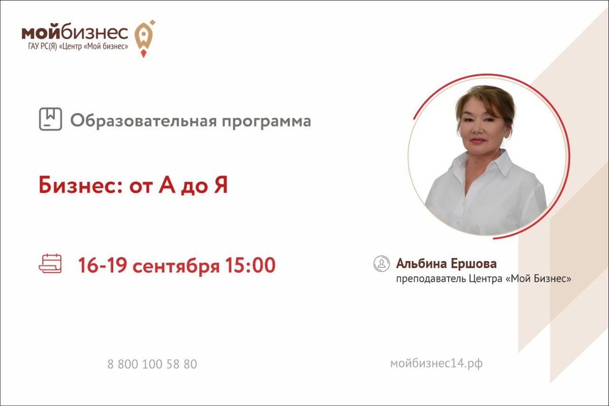 🚀Центр «Мой Бизнес» приглашает принять участие в образовательной программе «Бизнес: от А до Я». 🌟Программа «Бизнес: от А до Я» предназначена для потенциальных и начинающих предпринимателей по обучению навыкам создания бизнеса с нуля. ⚡Участники тренинга получат: - Знания в области юридических аспектов, маркетинга, калькуляции, финансового планирования; - Методы разработки бизнес-плана; - Инструменты анализа; - Полезные источники информации для бизнеса. 🎙️Спикер: Альбина Ершова, преподаватель Центра «Мой бизнес». 🗓️Дата: 16-19 сентября 2025 г. 🕛Время: с 15:00 ч. 🧑💻Формат обучения: онлайн 🔗Ссылка для регистрации ✔️Участники тренинга получат сертификат установленного образца @moibizsakha