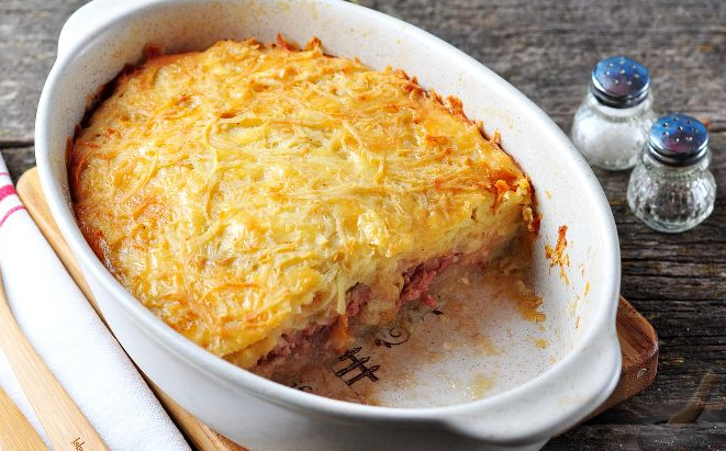 2. Картофель натрите на крупной тёрке и хорошо отожмите выделившийся сок. 3. Половину полученной массы выложите в форму для запекания, предварительно смазанную маслом. 4. Сверху распределите мясной фарш, приправьте солью и перцем. 5. Зелёный лук нарежьте мелкими кусочками. 6. Посыпьте луком слой фарша. 7. Сыр натрите на крупной тёрке. 8. Оставшийся картофель соедините с сыром, добавьте одно-два яйца, перемешайте и слегка приправьте солью и перцем. 9. По желанию в массу можно вмешать немного сметаны — это сделает вкус блюда нежнее. 10. Выпекайте запеканку при температуре 180 °C около часа. Подавайте её горячей, а для пикантности можно добавить горчицу Приятного аппетита!