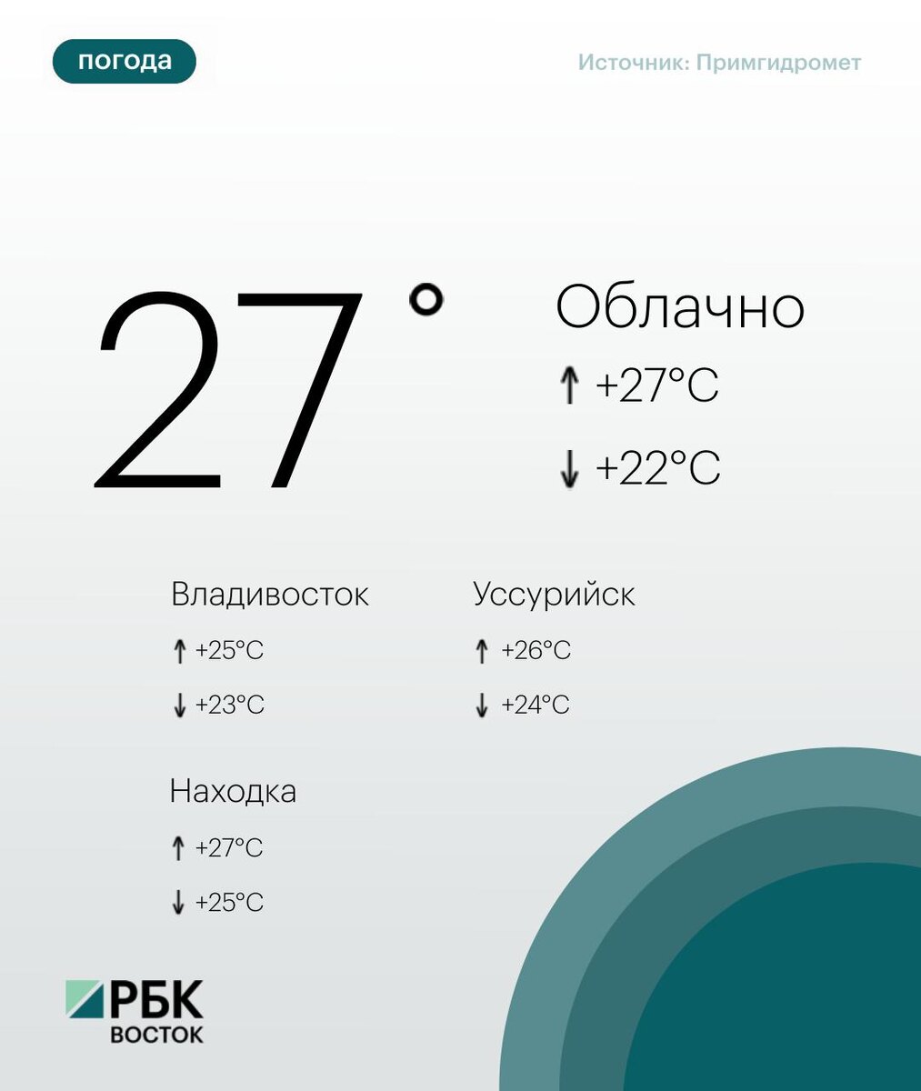 Сегодня погоду в Приморье определяют фронтальные разделы. Дождь, местами сильный, в отдельных районах очень сильный. Возможна гроза. Ветер северный, северо-западный умеренный, местами сильный. Температура воздуха +22...+27°C 🌧 Во Владивостоке облачно, дождь, временами сильный. Днем с прояснениями, в первой половине дня небольшой, утром умеренный дождь. Возможна гроза. Ветер северный, северо-западный умеренный до сильного, утром временами сильный. Температура воздуха +23...+25°C. 😃Подписывайтесь на РБК Восток