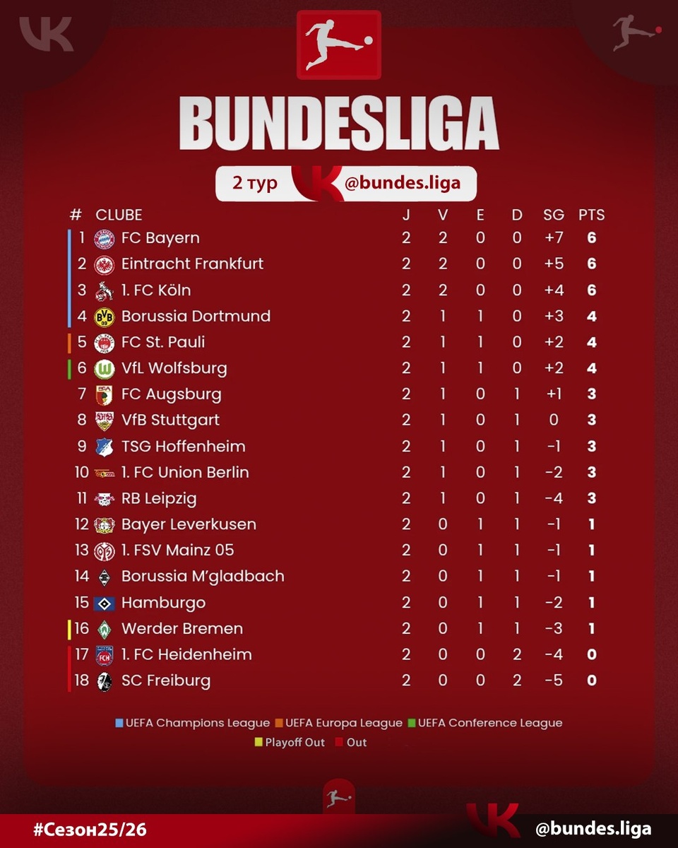 #Бундеслига 🇩🇪 Итоговая таблица Чемпионата Германии - 2025/2026 по футболу после 2-го тура