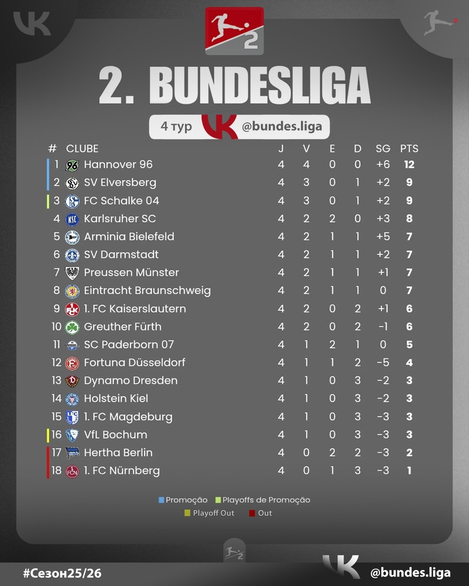 #2Бундеслига 🇩🇪 Итоговая таблица Чемпионата Германии - 2025/2026 по футболу после 4-го тура 2⃣ Бундеслига «Шальке 04» обыграл в гостях «Динамо Дрезден» 0:1, и попал в тройку по итогам 4-х туров. Лидерство у «Ганновер 96», который пока идёт без потери очков 🔥 Следим вместе за Второй Бундеслигой и ждём 5 тура! 📺⏳