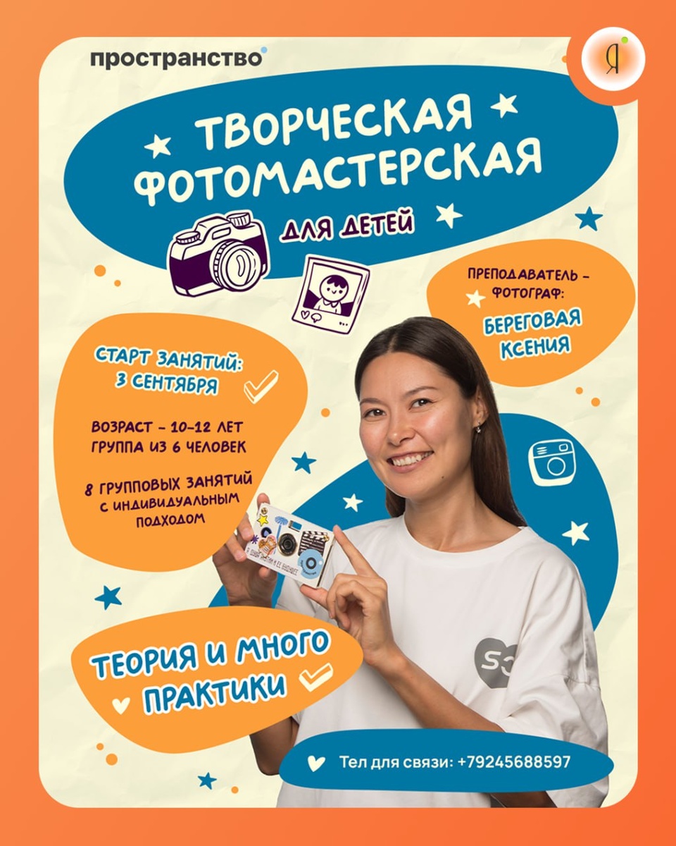 🤩 Творческая фотомастерская для детей #Детям #МК Фотография - самый доступный инструмент для самовыражения ☺️ Миссия творческой фотомастерской - помочь детям увидеть мир по-новому, развить их творческое мышление, эмоциональный интеллект и художественное восприятие через фотографию, обучая не только техническим навыкам, но и умению замечать красоту, ловить моменты и выражать свои идеи через визуальный образ. 🤩Преподаватель - фотограф Ксения Береговая. Возраст - 10-12 лет Группа из 6 человек 🤩Какие камеры подходят для работы - любые, кроме пленочных, подойдет даже камера на телефоне. 🤩8 групповых занятий с индивидуальным подходом- теория и много практики. 🤩Старт - 3 сентября, 2 раза в неделю , по средам и субботам, в 15:00. Итоговый проект - воскресенье в промежутке с 10:00 до 16:00. Занятия будут проходить на базе творческой платформы «Пространство». 🤩Урок длится 1,5 - 2 часа. После каждого занятия дается творческое домашнее задание, для закрепления урока. 🤩Подробности, с