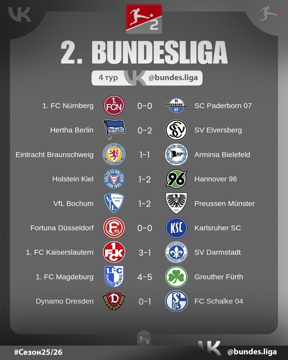 #2Бундеслига 🇩🇪 Результаты матчей 4-го тура Второй Бундеслиги