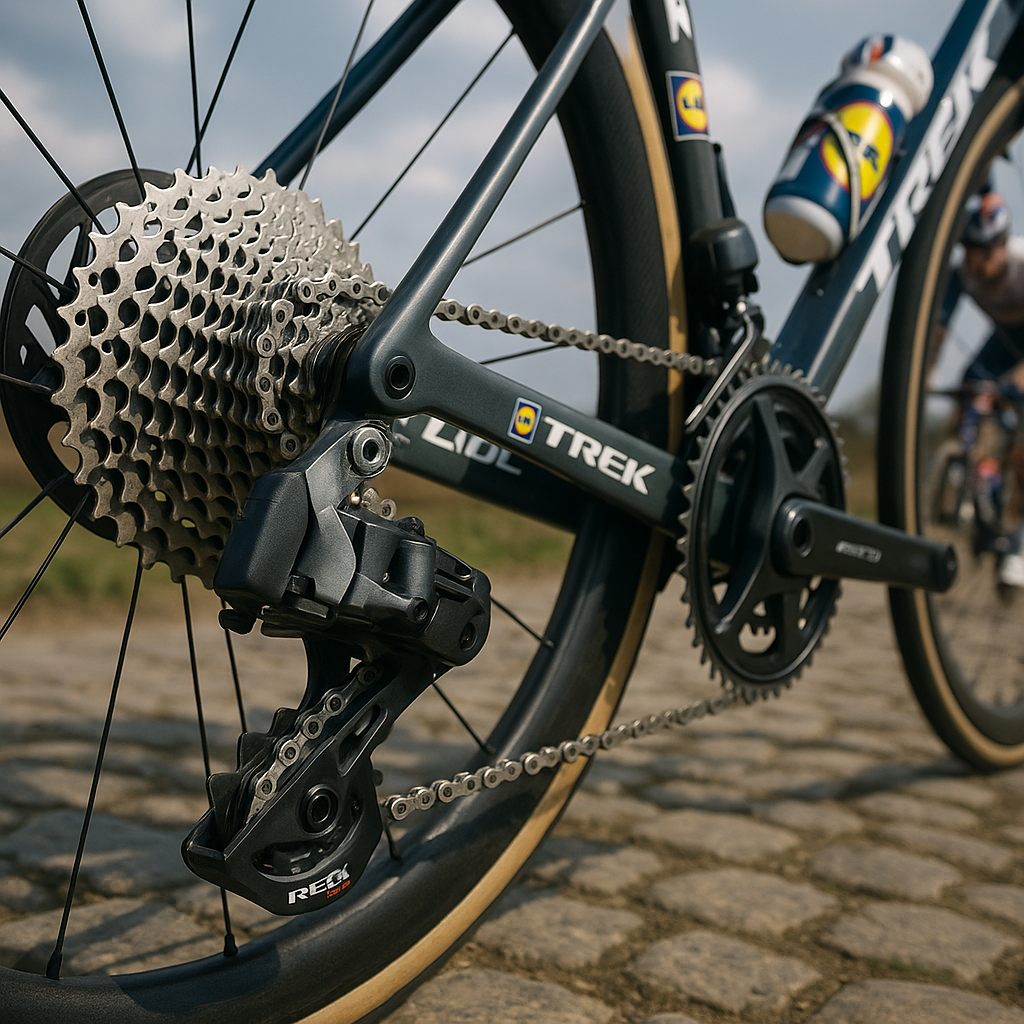 В 2025 году команда Lidl-Trek продемонстрировала нестандартный подход к настройке трансмиссии для Париж-Рубэ, сочетая компоненты SRAM RED XPLR 13-скоростной системы с 12-скоростной дорожной кассетой, что позволило оптимизировать диапазон передач, соответствующий требованиям плоского профиля трассы, и обеспечить надежность работы трансмиссии на сложном маршруте. Для адаптации 13-скоростного заднего переключателя SRAM RED XPLR к 12-скоростной кассете команда внесла изменения в конструкцию переключателя. В параллелограммной части было просверлено дополнительное отверстие, а также добавлен ограничительный винт, что позволило ограничить ход подвеса и обеспечить точную работу с 12-скоростной кассетой. Эти модификации были одобрены компанией SRAM, которая отметила, что конструкция переключателя и его крепление Full Mount, совместимое с интерфейсом UDH, обеспечивают необходимую прочность и устойчивость к ударам, что особенно важно на каменистых участках трассы. Переход на 1x-систему позволи