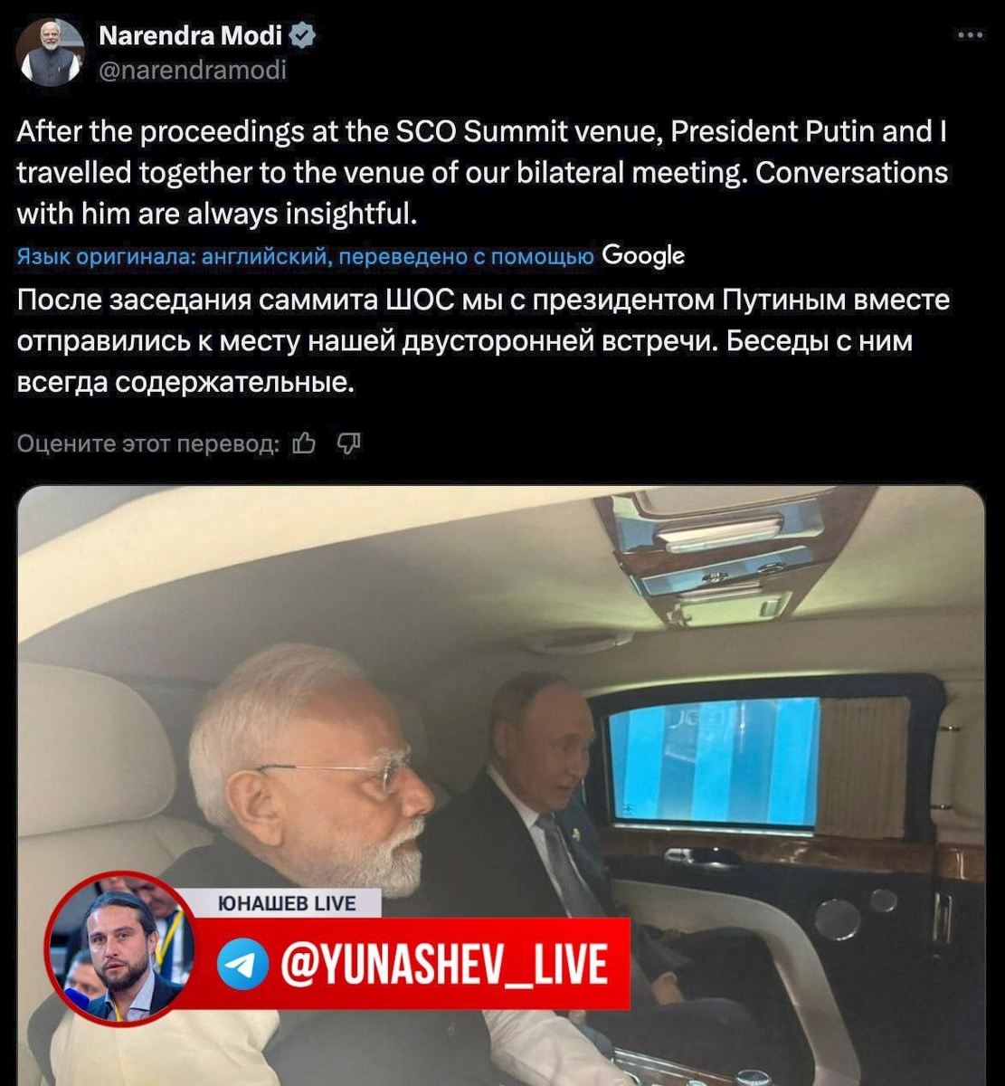 Официальная встреча Путина и Моди должна уже начаться, но лидеры пока не выходят из машины - видимо, очень интересная беседа. Делегации ожидают. Путин подвёз коллегу к месту проведения двусторонки на своем Aurus'е, чем индийский премьер тут же похвастался в своих соцсетях. Подписывайся на Юнашев LIVE 💬 Задать вопрос