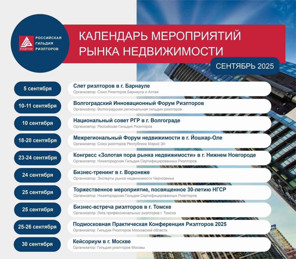 🗓 Календарь предстоящих событий рынка недвижимости в сентябре 2025! 🟡 Слет риэлторов в г. Барнаул 🕐 5 сентября Организатор: Союз Риэлторов Барнаула и Алтая 🟡 Волгоградский Инновационный Форум Риэлторов 🕐 10-11 сентября Организатор: Волгоградская региональная гильдия риэлторов 🟡 Национальный совет РГР в г. Волгоград 🕐 10 сентября Организатор: Российская Гильдия Риэлторов 🟡 Межрегиональный Форум недвижимости в г. Йошкар-Ола (прурочен к Дню рождения Союза риэлторов Респ. Марий Эл) 🕐 18-20 сентября Организатор: Союз риэлторов Республики Марий Эл 🟡 Поволжский конгресс «Золотая пора рынка недвижимости» в г. Нижний Новгород 🕐 23-24 сентября Организатор: Нижегородская Гильдия Сертифицированных Риэлторов 🟡 Бизнес-тренинг в г. Воронеж 🕐 24 сентября Организатор: Эксперты рынка недвижимости Черноземья 🟡 Торжественное мероприятие, посвященное 30-летию НГСР (г. Нижний Новгород) 🕐 25 сентября Организатор: Нижегородская Гильдия Сертифицированных Риэлторов 🟡 Бизнес-встреча риэлт