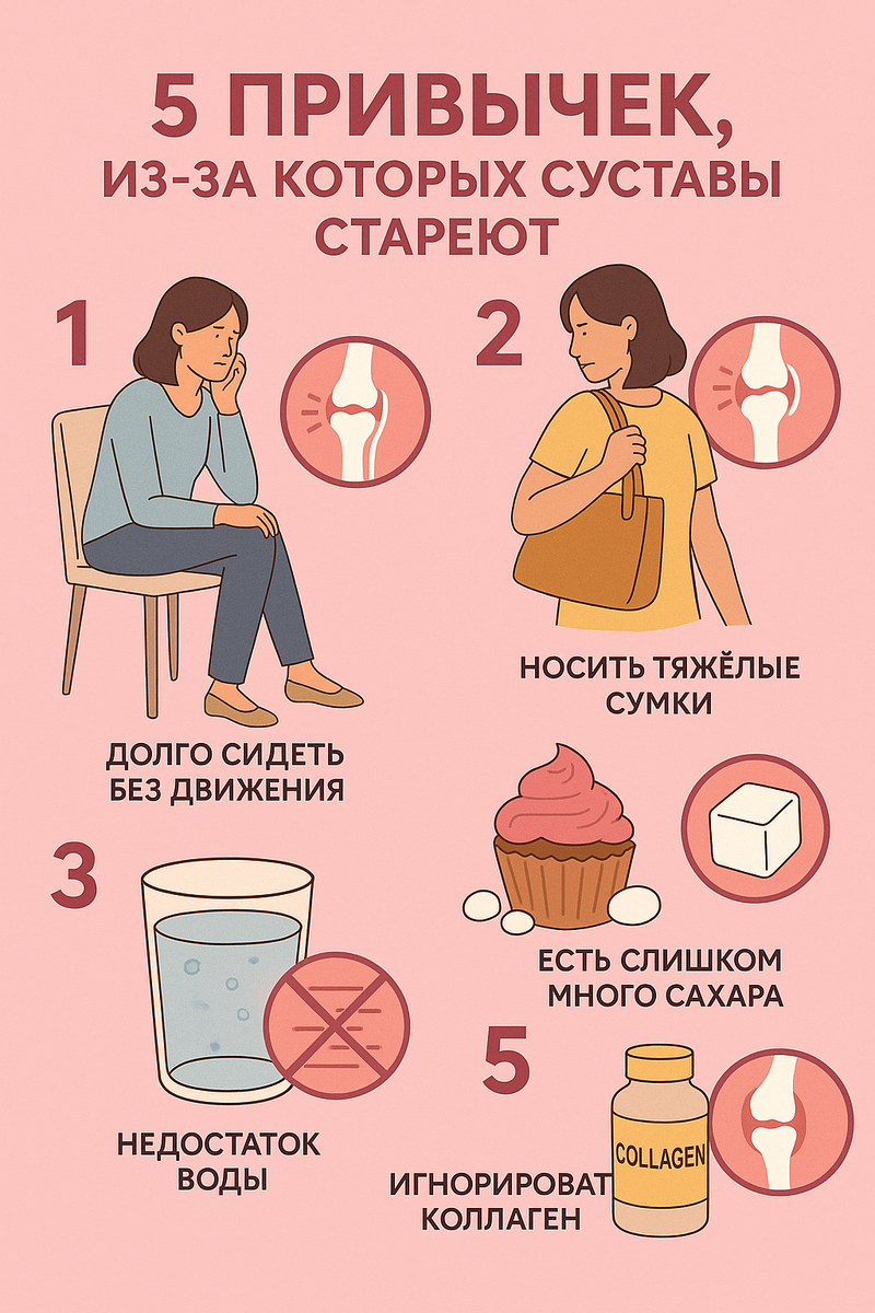 5 привычек, которые незаметно разрушают суставы. Проверила на себе — отказалась, и колени перестали хрустеть! Хруст в коленях, скованность по утрам, боль после долгой прогулки — кажется, что всё это приходит только с возрастом. Но правда в том, что суставы начинают стареть гораздо раньше. И часто причина не в годах, а в наших ежедневных привычках. Об этих ошибках я узнала от врача-ревматолога. И честно — половину из них совершала сама! Сидячая работа, сериалы по вечерам, поездки в машине — знакомо? Когда мы сидим неподвижно, суставы не получают питания. Ведь хрящ питается только во время движения — когда суставная жидкость «промывает» его. Что происходит: Решение: вставать каждые 40–60 минут, пройтись или сделать лёгкую разминку. Особенно женщины этим грешат: тащим по 5–10 кг из магазина в одной руке. Чем это опасно: Решение: использовать рюкзак или распределять нагрузку на обе руки. Сахар — это враг коллагена. Он разрушает волокна, делает их ломкими. В результате кожа стареет, а суст