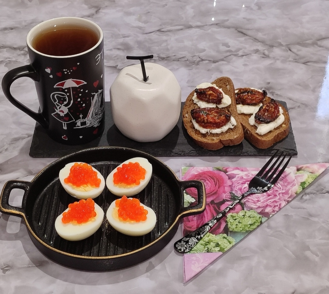 Два яйца вкрутую с икрой вместо соли, два тоста с моцареллой и вялеными помидорами и чай с сахзамом и лимоном.