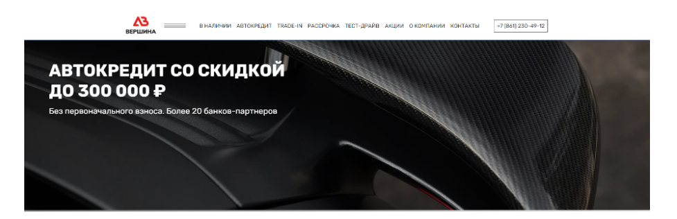 Вершина — это автосалон в Краснодаре. На сайте представлен каталог с новыми автомобилями. Дилер часто проводит различные акции, благодаря которым можно совершить покупку с большой выгодой. Больше интересного — в нашем обзоре. В автосалоне на Тургеневском шоссе 12В в Краснодаре можно купить как новый, так и подержанный автомобиль. В наличии более 20 марок. На сайте предусмотрен удобный фильтр, который значительно ускоряет процесс подбора нужного автомобиля. Дилер выступает в качестве кредитного брокера. Это значит, что в автоцентре Вершина можно оформить кредит на автомобиль прямо на месте. Кроме этого, у клиентов есть возможность заранее узнать ориентировочные условия, на которые они могут рассчитывать. Для этого нужно заполнить форму обратной связи на сайте. Обращаем ваше внимание, что речь идет лишь о предварительных условиях. Окончательное предложение можно получить только в салоне после подтверждения персональных данных. В дилерском центре часто проводятся различные акции, котор