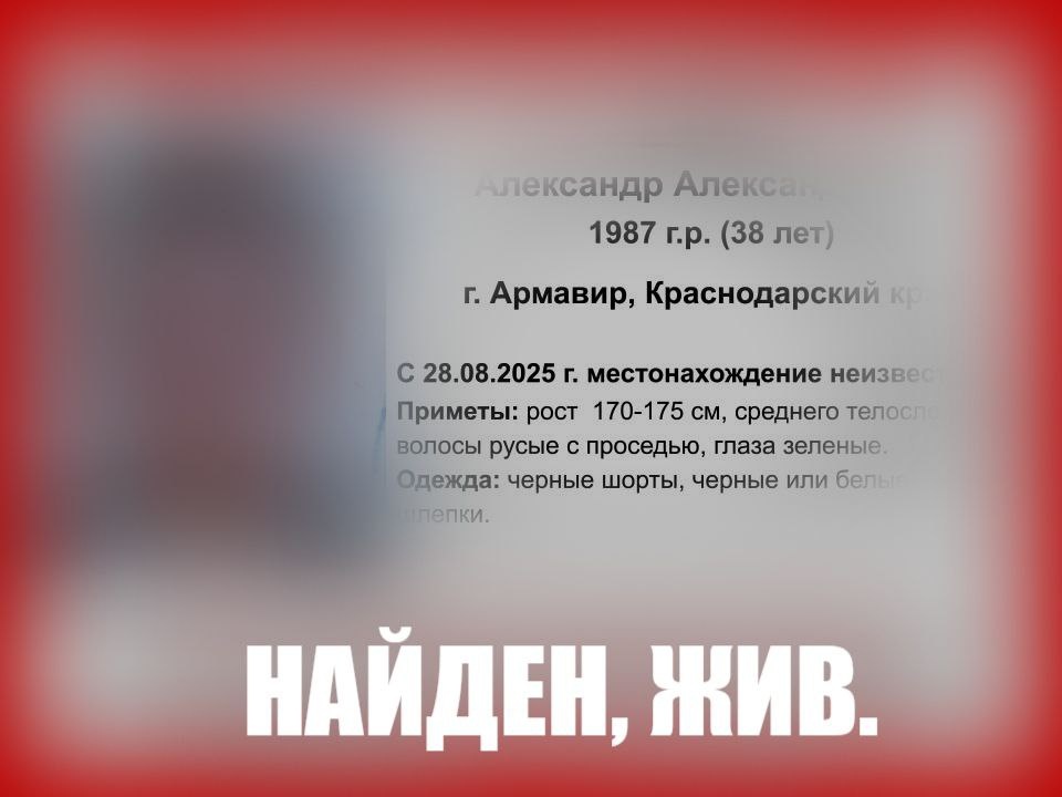 UPD: Найден, жив. Местоположение установлено сотрудниками отдела Уголовного розыска Отдела МВД России по Курганинскому району. Внимание! Пропал человек! #Шульга Александр Александрович, 1987 г.р., (38 лет). г. #Армавир, #Краснодарский край. С 28.08.2025 г. местонахождение неизвестно. Инфорг поиска: Юлия 89528724228 Всех, кто обладает информацией о пропавшем, просим сообщить по телефону бесплатной горячей линии 88005501054 или 112. Если вы готовы помогать в поиске пропавших без вести, приглашаем присоединиться к телеграм-чату оповещения: t.me/poisk_193