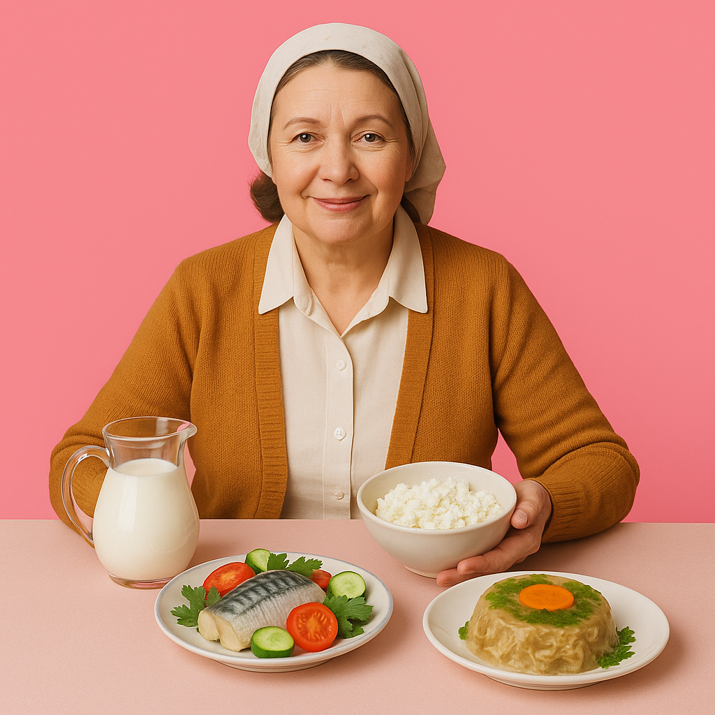 Советская диета для крепких костей и суставов: что ели наши бабушки — и почему это работает лучше модных суперфудов Сегодня магазины завалены экзотическими «суперфудами» и дорогими добавками. Но интересно, что в Советском Союзе люди питались проще — и при этом кости у многих оставались крепкими, суставы — гибкими, а переломы случались реже. Почему так? Всё дело в особых привычках питания. Давайте разберём, что ели наши бабушки и дедушки — и чему мы можем у них поучиться. Тогда не было моды на фастфуд. Люди ели простую, но насыщенную белком и минералами еду. Основу рациона составляли продукты, богатые кальцием, белком и коллагеном — именно они отвечают за прочность костей и гибкость суставов. Утро в советской семье часто начиналось с тарелки творога или стакана кефира. Это — лучшие источники кальция. Почему полезно: Шпроты, килька, сельдь, скумбрия — всё это регулярно было на столе. Польза: Любимое праздничное блюдо. Его готовили из костей, хрящей, курицы или говядины. Почему работает: