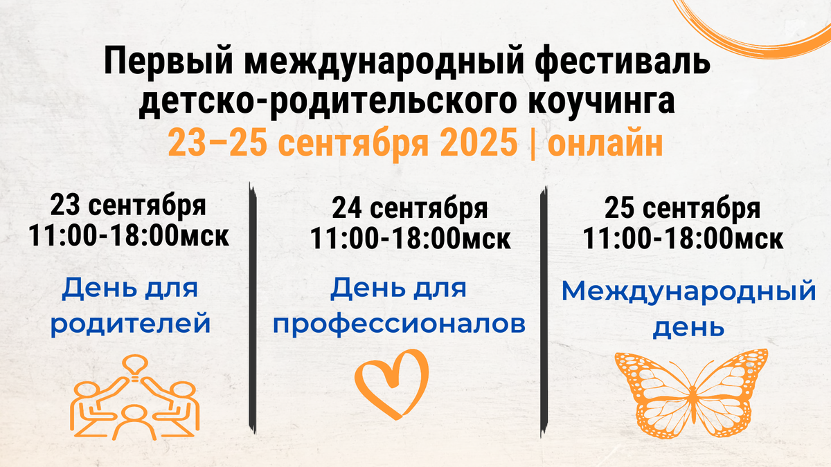 Сегодня первое сентября – день знаний, а это значит, что сегодня – прекрасный день для анонса очень интересного мероприятия! Приглашаем вас на Первый международный фестиваль детско-родительского коучинга: https://coachforkids.org/coachkidsfest2025 23–25 сентября 2025 | онлайн Что будет на фестивале? 10+ выступлений - от родителей, чья жизнь изменилась благодаря детско-родительскому коучингу - от практикующих профессиональных детских коучей из разных стран - от специалистов, применяющих в своей работе детский коучинг: учителей, репетиторов, психологов. спортивных тренеров, профориентологов Демонстрационные сессии Профессиональные детско-родительские коучи проведут сессии в прямом эфире Коучинговые практики и рабочая тетрадь Всем зарегистрированным будет выслана рабочая тетрадь фестиваля и расписание на 3 дня Возможность поработать с коучем бесплатно Всем желающим мы предложим участие в демонстрационных коуч-сессиях у профессиональных коучей Живое общение с экспертами У вас будет возможн