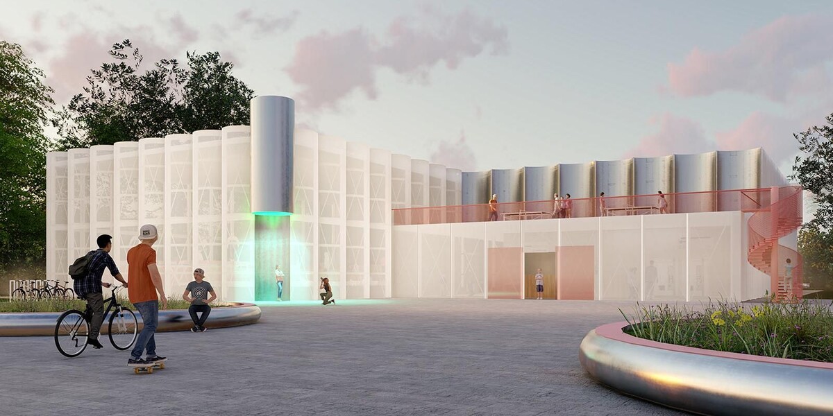 Площадь спортивно-досугового центра составит более 2,1 тыс. кв. м. На первом этаже разместятся батутный центр, компьютерный клуб и крытое помещение для скейт-парка. На антресольном этаже — верхнем полуярусе в виде открытой галереи с перилами — выделят три вспомогательных пространства с выходом на открытую веранду. Рядом с павильоном расположится открытая часть скейт-парка.