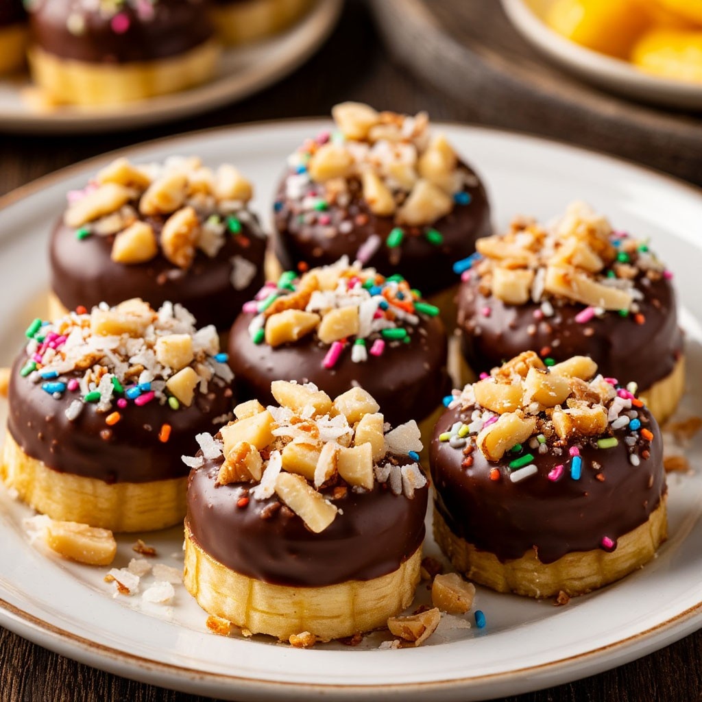 2. Как только шоколад стал полностью жидким и однородным, наденьте кусочки банана на шпажки или вилки. Аккуратно окуните каждый кусочек в растопленный шоколад, вращая его, чтобы убедиться, что он покрыт со всех сторон. После этого сразу же обваляйте банан в кокосовой стружке и подготовленной посыпке.