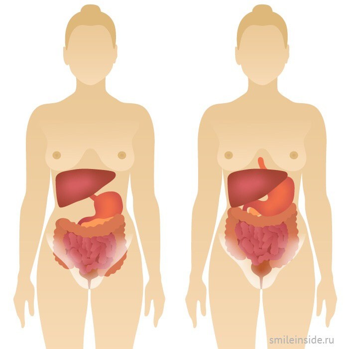❌ Нарушение моторики — опущенные органы образуют перегибы, создается давление и в петлях кишечника замедляется продвижение пищи.