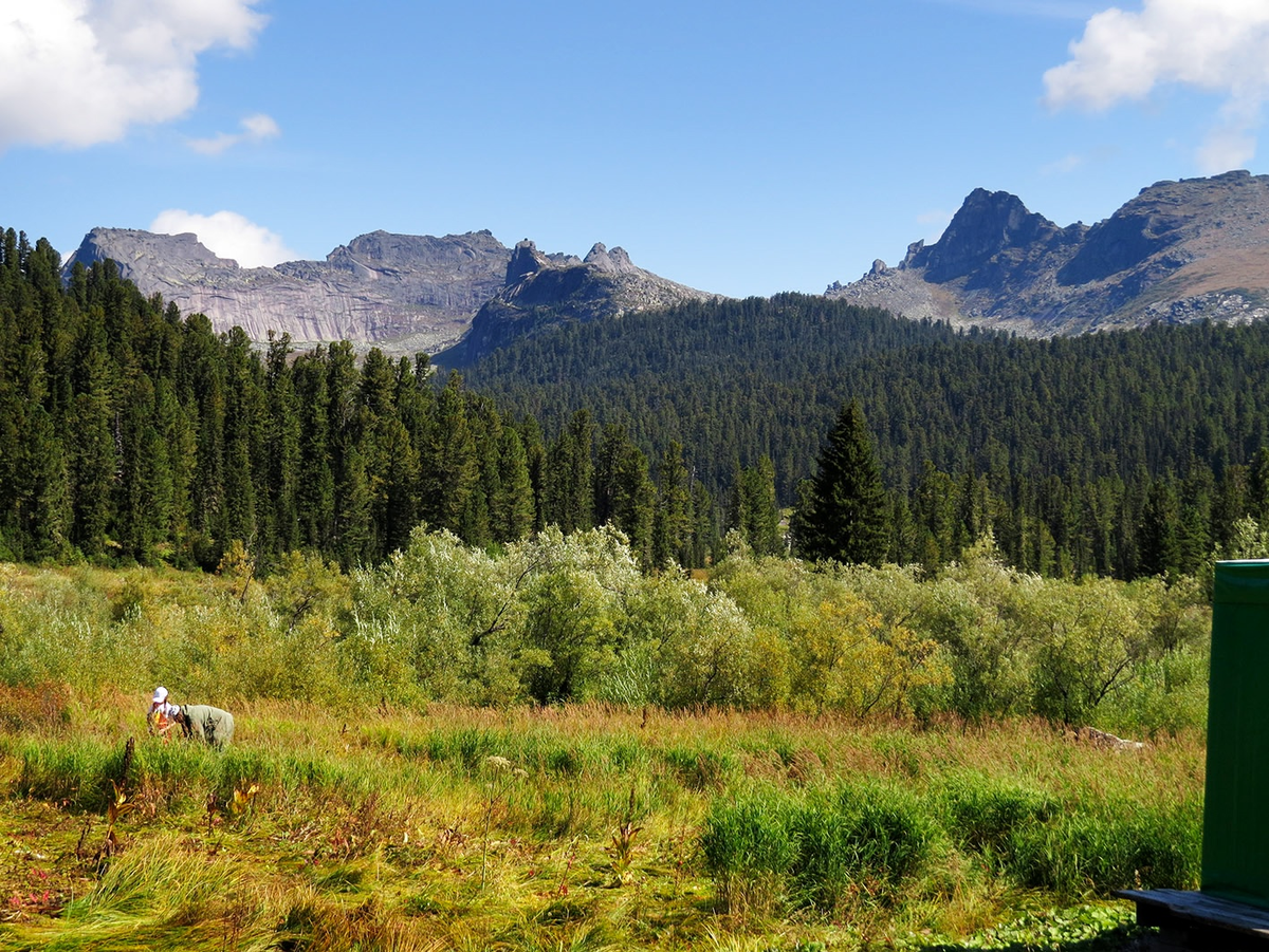 -О, ещё одни приехали медведей покормить! - сказали ребята, выходившие нам навстречу из визит-центра Ергаки. Наташа заволновалась, мы с Аделиной посмеялись. В визит-центре у трассы я зарегистрировал нашу маленькую, спонтанно возникшую группу, и обсудил с сотрудниками маршрут. На первый день предстояла самая лёгкая его часть - поход к Висячему камню. А ещё легче его сделали люди с проезжающего мимо джипа, по своей инициативе подбросившие нас последние два километра автодороги - без этого я не был уверен, что выйдя на маршрут в 13 часов, мы всё успеем. Впереди манил Спящий Саян - пожалуй, самая впечатляюще издали часть хребта Ергаки, по мере приближения распадающийся на отдельные горы. Хотя вообще-то в этой своей части Ергаки - действительно парк для прогулок, пожалуй даже более благоустроенный, чем Красноярские Столбы. Широкая тропа по прекрасному лесу сменялась дощатыми настилами над болотом. Через каждый ручей тут мост, на каждом обрыве - лестница, и хотя ползти по этим лестницам под