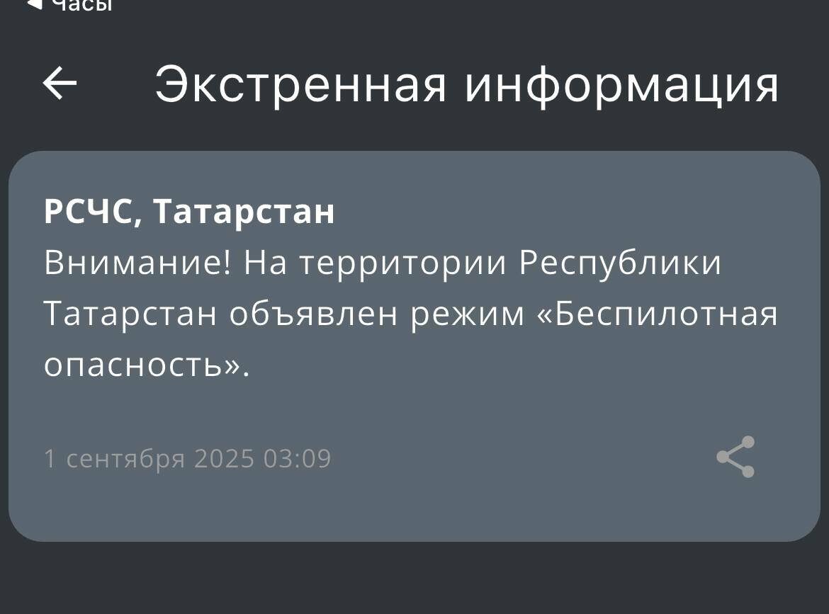 В Татарстане с 03:09 действует режим «Беспилотная опасность». Кроме того, в официальном приложении МЧС сообщили о введении плана «Ковер» в аэропортах Казани и Нижнекамска. В Нижнекамске и Елабуге действует угроза атаки БПЛА. Жителям необходимо спуститься в укрытия.