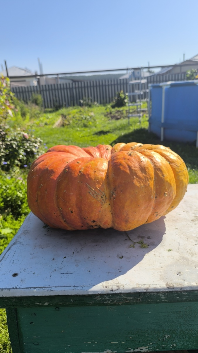 Ну вот и осень пришла сегодня школьники и студенты начинают новый учебный год. Мы не исключение. Но у нашей семьи это день связан не только с днём знаний. 1 сентября у нас годовщина свадьбы. Пока срок не круглый хотя для меня значительный 19 лет. Погода просто чудесная тепло и солнечно обещают. На даче вчера водрузили на пьедестал главный осенний атрибут. Шикарную тыкву сорта "Сладкий пирог ", я боялась что на кусту она одна только и вырастит ведь ее размер меня давно впечатляет. Но буквально три недели назад на другой плете на конце завязалось ещё три завязи и сейчас они активно растут. А эту красоту мы сняли пока я пыталась секатором отрезать короткую и доступ плодоножку от плети она в итоге сама хрустнула и оторвалась. Да с таким хвостиком она долго не подлежит к сожалению . Но очень хочется чтобы жёлтый бочок на солнышке добрал цвета, а потом и дегустировать можно. Из дел в выходные мы докопали картошку, собрали немного урожай из остатков помидор и перец начавший краснеть. Отпал
