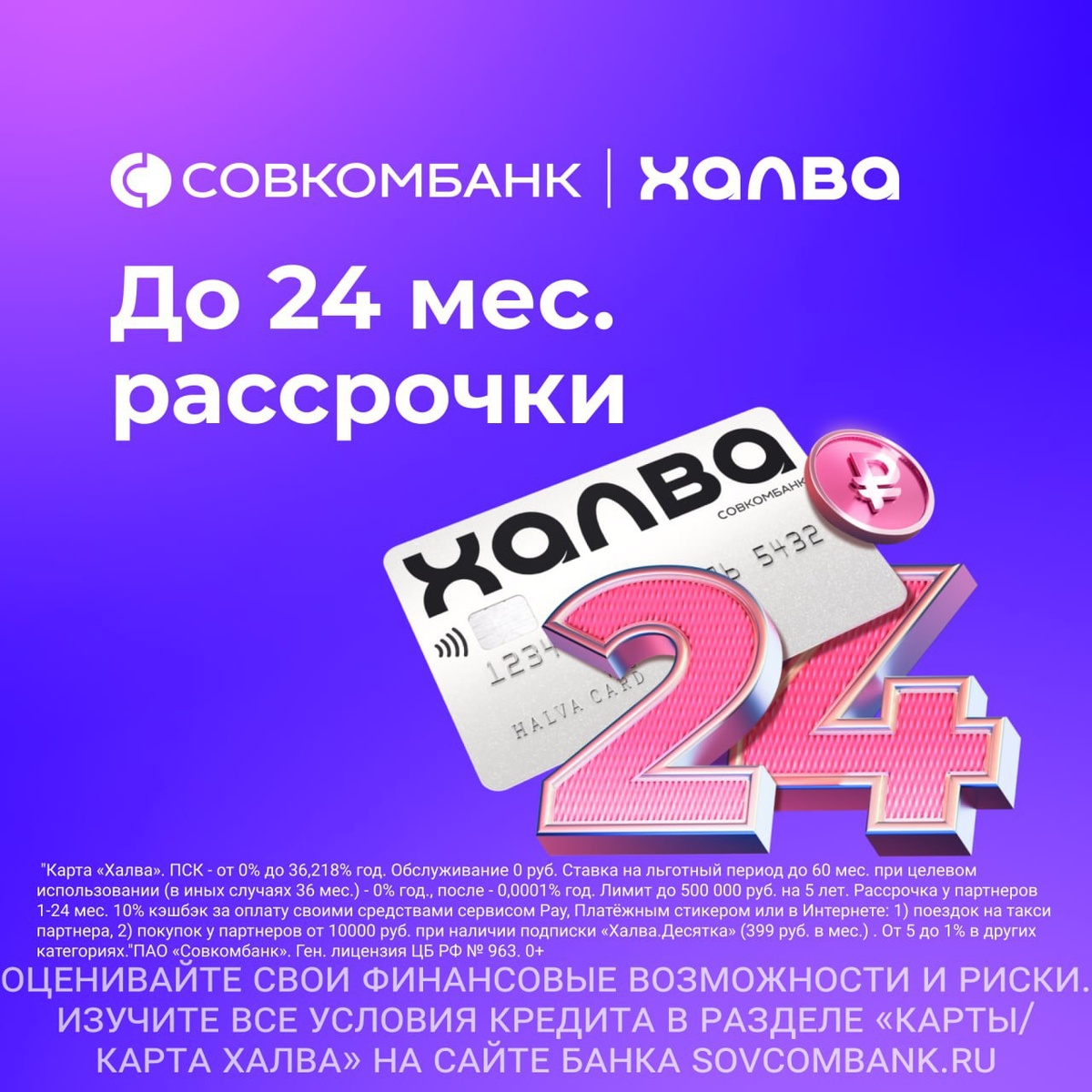 🔥 Рассрочка на любые покупки до 24 месяцев у партнеров + кэшбэк до 5000₽ в месяц по бесплатной карте «Халва
