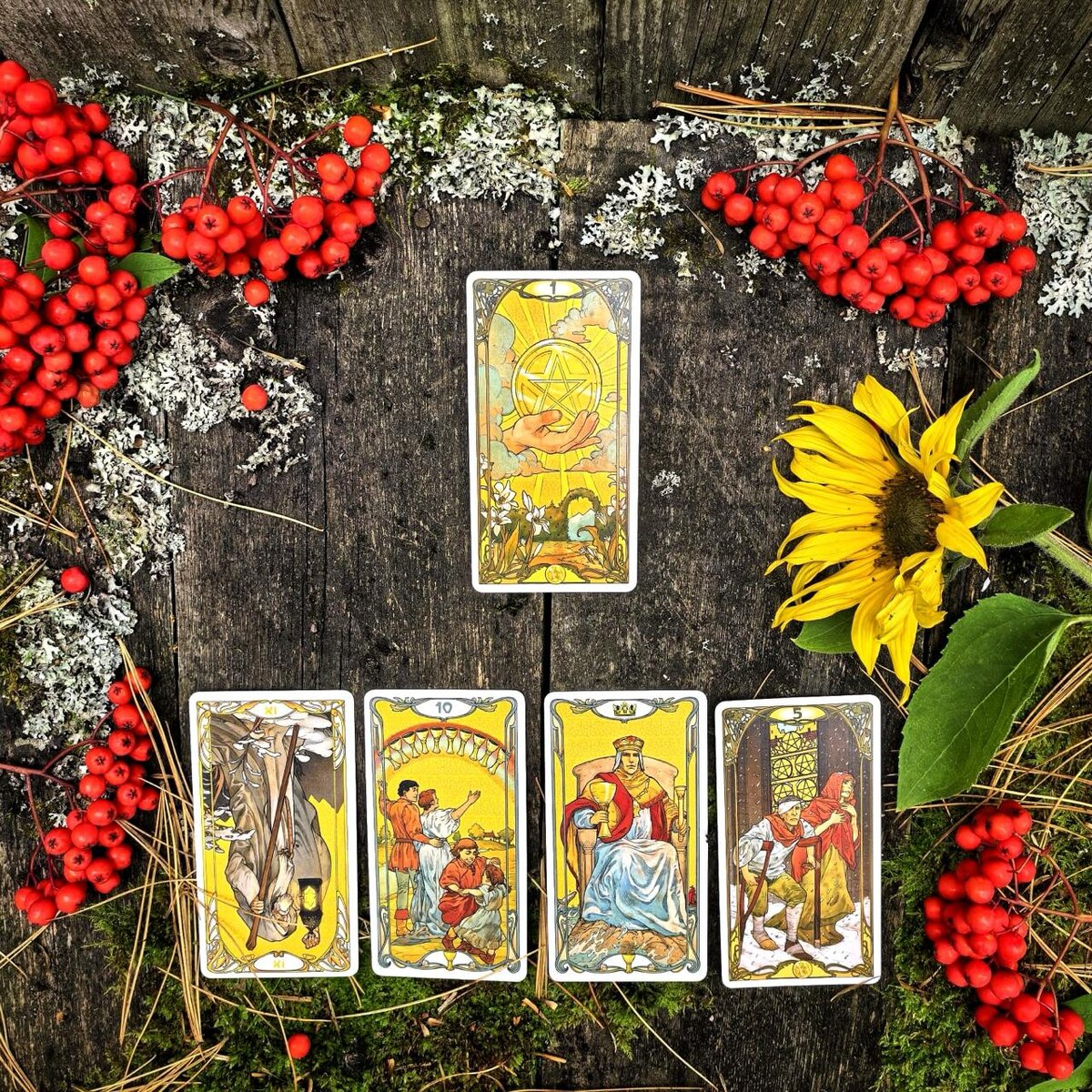 💡Совет на неделю. Будьте внимательны к возможностям, которые открывает для нас Туз Пентаклей ✨. Ищите поддержку, если трудно справиться в одиночку 🙂. Действуйте активно, но с умом 🧠. Цените гармонию и заботу о близких 💖. Посейте семена будущего успеха и держите курс на результат 🌱. А вот и яркое осеннее оформление нашего расклада от Ларисы! ❤️