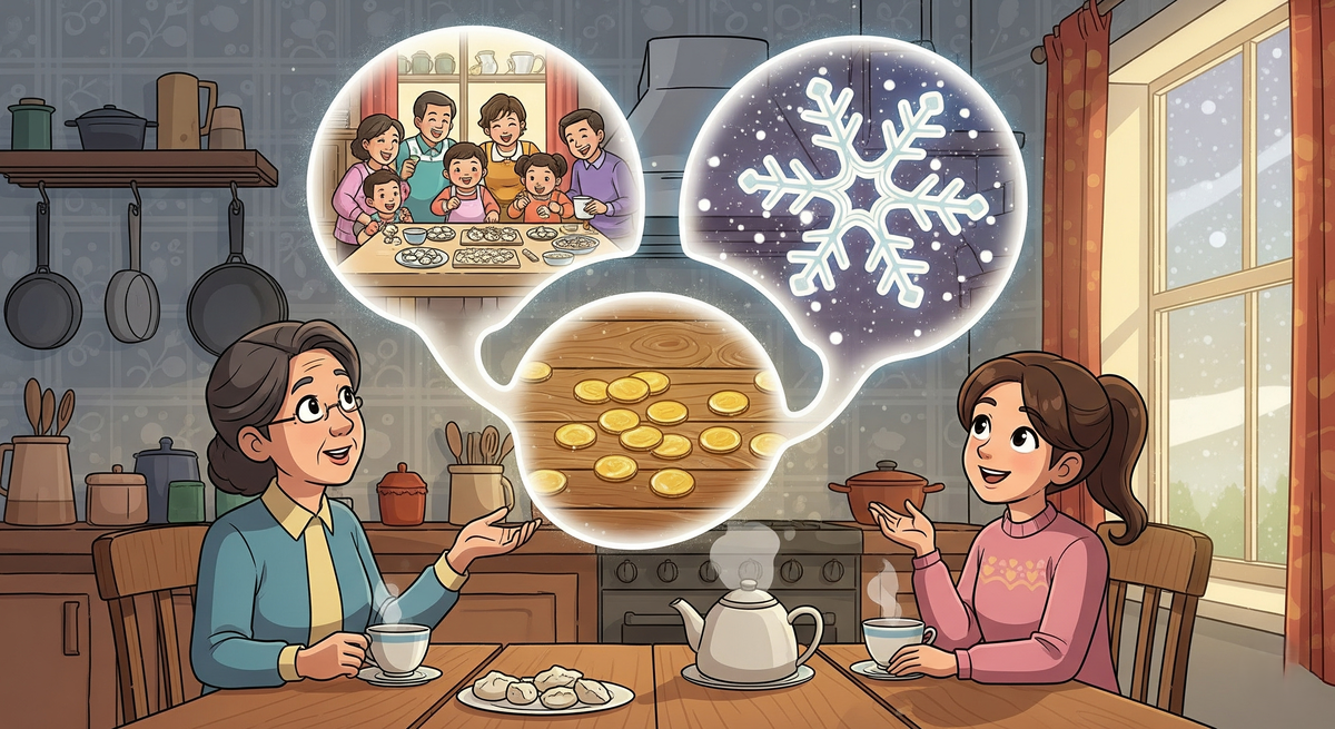 — Помнишь, тётя, как мы все вместе лепили пельмени? Ты, мама, бабушка... И потом мы нашли в одном из них монетку! Это было так здорово — вся семья смеялась, снег за окном падал огромными хлопьями...