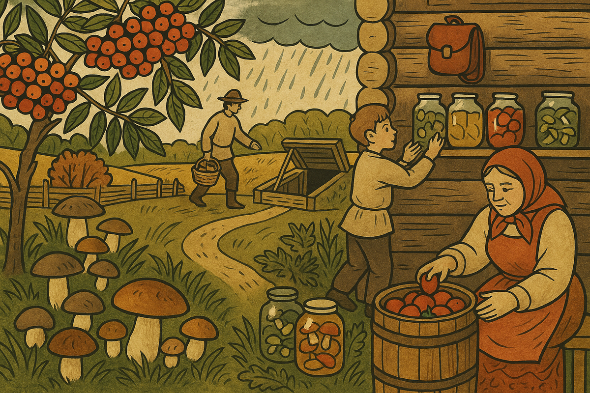 Второй день осени — про «устроиться». В воздухе пахнет мокрой травой, на ветках наливаются гроздья рябины, а в низинах тянется туман. Селяне в такую пору раскладывали по местам летний труд: не торопясь, со вкусом, с уважением к каждой банке и каждому мешочку. Сегодняшний день — отличный повод привести в порядок погреб, расставить соленья и маринады, проверить крышки, а заодно заняться «малой ревизией» в доме. «Как только рябина загорится, — говорила бабка Марфа, — считай, осень постучалась. Мужики в лес — за грибом, ребятня — за орехом, а мы на завалинке — банки вытираем да крышки кипятим. Не бегом, не наскоком: баночка к баночке, тряпочка к тряпочке. И погреб любит ласку: посвети, проветри, пол укрой свежей соломкой. Тогда и зима не страшна — у тебя запас не просто стоит, он тебя ждёт». 1. Погреб и полки. 2. Банки — в «семьи». 3. Грибы — с уважением к тишине.