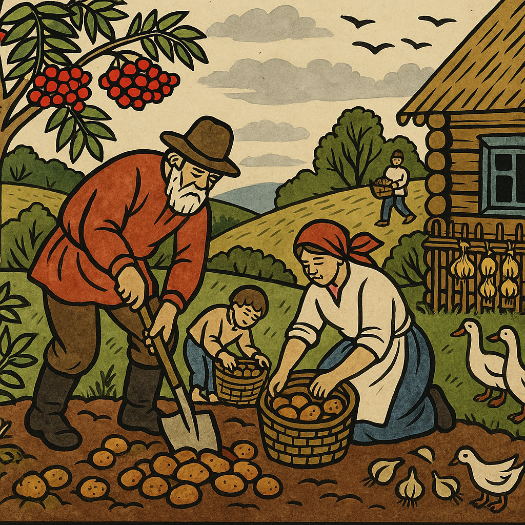 Третий день осени — про землю и терпение. Двор ещё пахнет тёплой пылью, в небе — рваные облака, а на грядках стынут огуречные плети. В такой день у нас в семье всегда «картофельный лад»: копка, сортировка, первые бурты, проветривание погреба и непременно вечерняя чашка чая с горячей картошкой в мундире. Никакой суеты: работа идёт мерно, чтобы каждая вещь заняла своё место до холодов. «Картошка любит ладные руки, — говорила баба Варя. — Не ковыряй землю, а слушай её. Штык вонзи, приподними, ладонью примешь клубни — и в лукошко. Селёдкой солить не надо, а вот добрым словом — обязательно. Тогда и лежать будет хорошо, и зимой на стол пойдёт, как с грядки». В сетках на чердаке? Подойдёт лишь на несколько дней: протянуть до окончательной закладки. Обязательно сквознячок и тень, не пересушить.