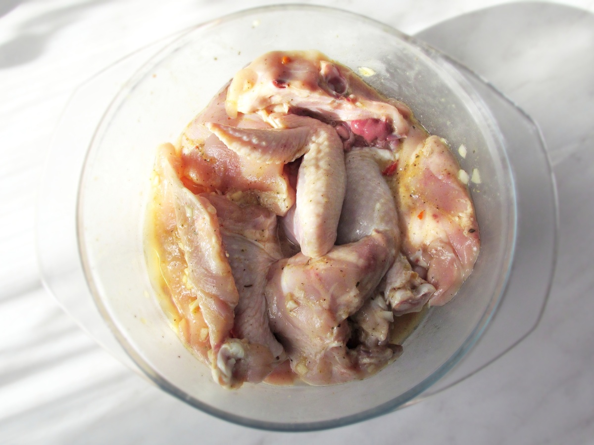 Купила куриную тушку, решила её сразу разделать и замариновать. У меня ещё с прошлого года стоит банка мёда, он уже давно не жидкий, потому есть его особо никто не хочет. Выпечкой я в последнее время как-то не очень увлекаюсь, потому расходую мёд иначе, например, добавляю в мясо. Так что и в этот раз мёд стал одним из ингредиентов маринада для курицы. Тушку я использую не целиком, филе грудки решила не готовить, а убрать в морозильную камеру. С бёдер и спинки сняла шкурку, на крыльях и голенях её оставила. Для начала я выложила части курицы (голени, крылья, бёдра, спинку и каркас грудки) в глубокую чашу, затем полила их тремя чайными ложками мёда, который предварительно подогрела в микроволновке, чтобы он стал жидким (грела импульсами в три захода по 5-8 секунд). Добавила два крупных зубчика чеснока, специи (использовала приправу для курицы и универсальную, они обе с солью) примерно 2 чайные ложки, столовую ложку винного уксуса, 4 столовые ложки подсолнечного масла. Перемешала, накрыла