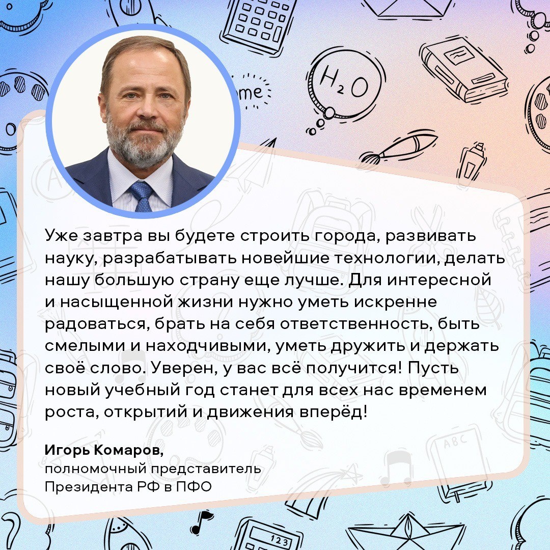 С Днем знаний школьников и студентов Башкортостана поздравил полномочный представитель Президента России в ПФО Игорь Комаров. Он пожелал ребятам успехов в учебе и новых побед. Пусть новый учебный год станет для всех нас временем роста, открытий и движения вперёд! отметил Игорь Комаров. В 2025 году в Башкортостане за парты сядут более 500 тысяч школьников. Для 45 тысяч ребят школьный звонок прозвенит впервые. Источник https://uchaly102.ru/?p=97565