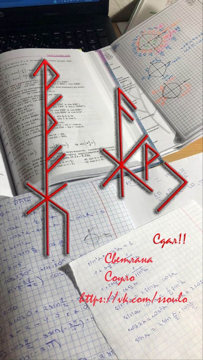 Ставы для успешной сдачи экзаменов , поздновато конечно , но на вступительные еще пригодиться))) 1. первый большой наносим на фото , скрин учебников или зачеток ( что у кого) 2. второй на левую руку , но можно и на фото ребенка. у меня все как обычно просто без выкрутасов: первый став: Гебо- взаимосвязь людей ( в данном случае поступающий и приемная комисия) Уруз- придает решимости ,веры и мощи духа - ведь мы все когда очень переживали на экзаменах)) Феху- сам предмет Соуло- победа Тейваз+ Вунье- радостный прорыв , мощно и просто сдал!! Вторая работа, ставиться именно на ребенка или его фото : Гебо- общение , энергообмен действующих лиц)) Ансуз- разговорный жанр -то, что отвечает ребенок и конечно поддержка ВС , инфа через поток . Йера- отличный урожай и в ней Вунье- как радостное состояние от итога проделанных действий)) Ставы отработали на ура , особо переживающие мамы довольны)))