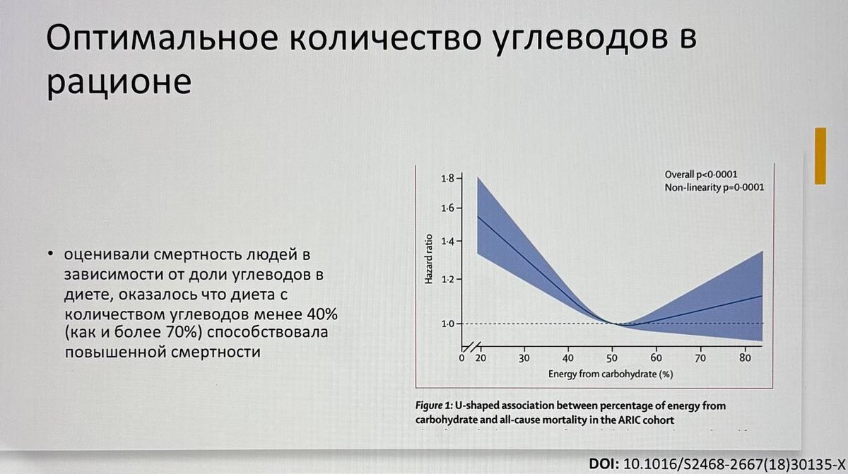 Сегодня поговорим немного об углеводах. Для этого возьмем исследование DOI 10.1016/S2468-2667(18)30135-X: “Dietary carbohydrate intake and mortality: a prospective cohort study and meta-analysis”, авторы: Seidelmann и команда, опубликовано в The Lancet Public Health в сентябре 2018 года . Что изучали? • 15 428 взрослых (возраст 45–64 лет), участники когорты ARIC (Atherosclerosis Risk in Communities), опрос питания проводился в период 1987–1989 гг. • связь между долей энергии из углеводов и общей смертностью, с учётом сложных (не линейных) зависимостей. • включал данные из семи международных проспективных исследований (в общей сложности 432 179 участников) Ключевые выводы 1. риск смерти был выше при низком (< 40 %) и при высоком (> 70 %) потреблении углеводов. Оптимальная зона — 50–55 % энергии из углеводов, где смертность минимальна 2. в широком анализе, и в ARIC — наблюдается та же U-форма. • Низкое потребление углеводов (< 40 %): Hazard Ratio (HR) ≈ 1.20 (95 % C