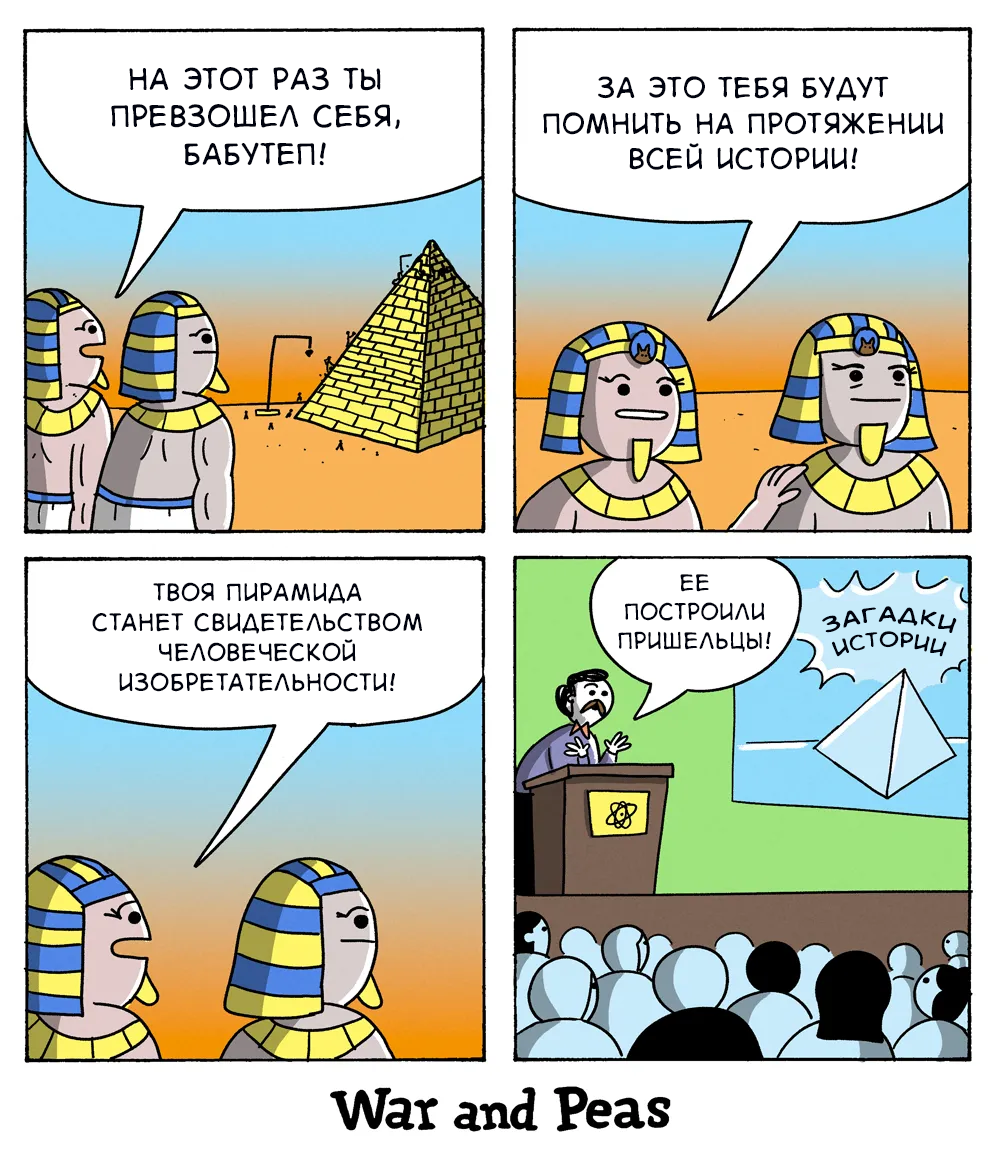 Интернет, конечно, объединил людей, но в то же время успел стать и рассадником целой массы теорий заговора - одна фантастичнее другой. Некоторые люди в сети всерьез говорят о том, что планета Земля на самом деле плоская, пирамиды построили инопланетяне, мир заполонили рептилоиды, а известного актера Джима Керри подменили. Но что для кого-то серьезная причина для беспокойств, для других - повод для шуток. И сегодня я как раз решил собрать для вас десятку юмористических комиксов о самых разных теориях заговора. Надеюсь, что вам понравится! В серии комиксов War and Peas («Война и Горох», созвучно с «War and Peace» - «Война и мир») от немецких художников Элизабет Пич (Elizabeth Pich) и Джонатана Кунца (Jonathan Kunz) вам могут встретиться ведьмы, вампиры, роботы, сумасшедшие ученые и многие другие - спектр разнообразия персонажей очень велик. А одна из недавних зарисовок была посвящена древним египтянам. Раз уж речь уже зашла про пришельцев - сложно не вспомнить про такой феномен, как круг
