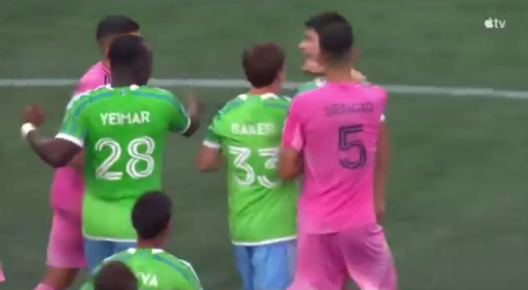 «Интер Майами» уступил со счетом 0:3 в финальном матче Кубка лиг. После финального свистка между футболистами и выбежавшими на поле тренерами и сотрудниками возникла потасовка, в которой участники стычки обменивались толчками. В ходе стычки Бускетс ударил кулаком в челюсть хавбека «Сиэтла» Обеда Варгаса, праздновавшего победу вместе со своим одноклубником Коди Бейкером – после удара Варгас упал на газон. Затем полузащитник «Интер Майами» схватил сзади за шею Бейкера, который кричал испанцу в лицо. Футболистов попытался разнять защитник «Сиэтла» Еймар Гомес. Перед этим эпизодом Варгаса грубо обнял сзади за шею Луис Суарес – Еймару Гомесу удалось предотвратить потасовку между игроками. Скриншот: трансляция Apple TV Суарес плюнул в сотрудника «Сиэтла» на фоне 0:3 в финале Кубка лиг. Между игроками «Интер Майами» и «Саундерс» возникла стычка после матча