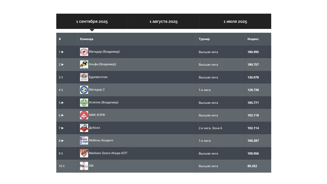 📊 Рейтинг команд на 1 сентября 2025 г. 💪 Индекс силы команд, участвующих в турнирах города Владимира. 🧮 Индекс рассчитывается ежемесячно на основе показателей выступлений команды за последние 5️⃣ сезонов. Движение команды относительно предыдущего рейтинга: ⬆ - поднялась, ⬇ - опустилась, ▶ - осталась на том же месте. 🔝 На основе рейтинг определяется, к примеру, топ-матч очередного тура. Полностью рейтинг – по ссылке 👇 https://befutsal.ru/ranking.php