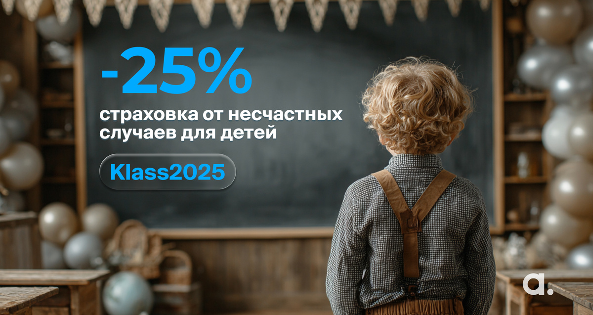 К началу учебного года приготовили для вас подарок: скидку 25% на страховку от несчастных случаев для детей от 3 до 17 лет. Полис покроет расходы на медицинские услуги, если ребенок получит травму на уроке физкультуры, на перемене или после школы, например, катаясь на велосипеде. Важно! Если ребенок занимается в спортивной секции и есть риск получить травму, обязательно укажите это при заключении договора. Акция действует с 1 по 30 сентября 2025 года. Чтобы получить скидку нужно ввести промокод Klass2025 на нашем сайте.