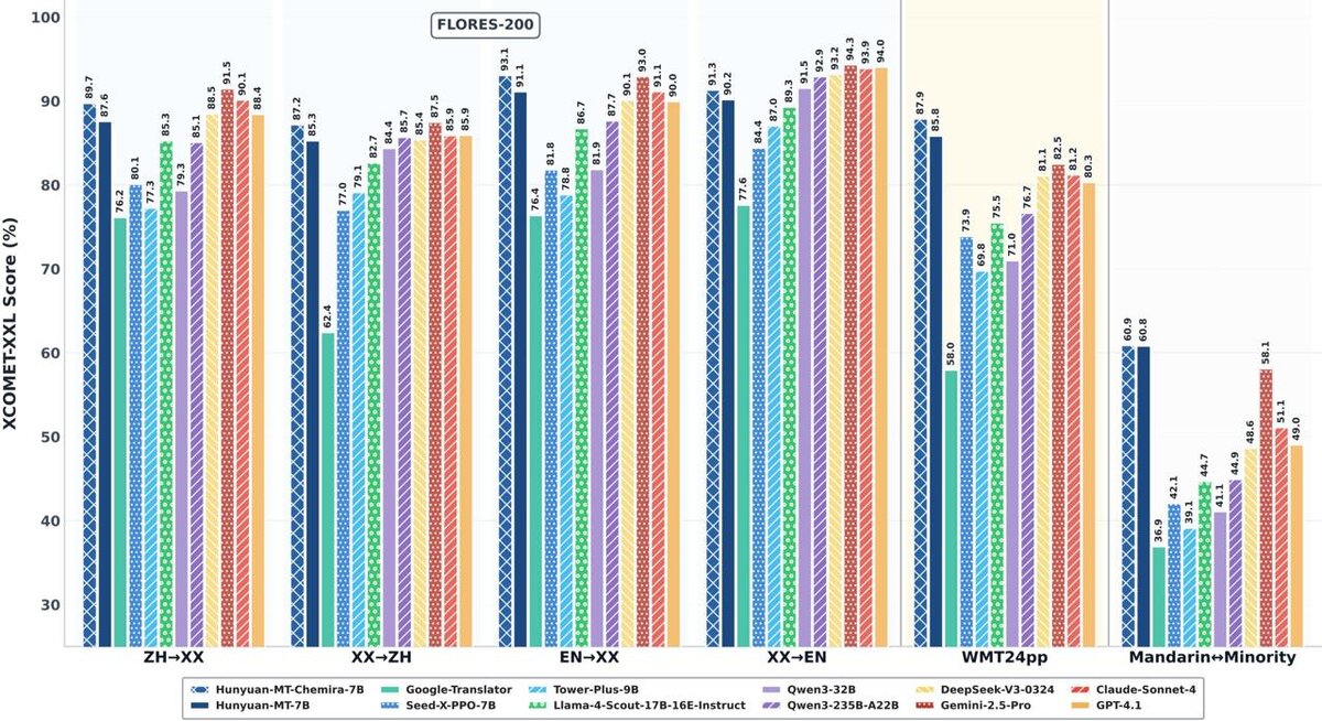 ⚡️ Tencent дропнули Hunyuan-MT — мощные open-source модели для перевода Что внутри: - Доступны модели Hunyuan-MT-7B и Hunyuan-MT-Chimera-7B - Поддержка 33 языков - Chimera-7B — это первая d индустрии откртытая ансамблевая модель 🏆 Результаты: - 1-е место в 30 из 31 категорий на международном конкурсе WMT25 (Workshop on Machine Translation 2025, крупнейшая в мире конференция-соревнование по машинному переводу) - Hunyuan-MT-7B лидирует среди моделей своего размера 🟠Модели: https://huggingface.co/collections/tencent/hunyuan-mt-68b42f76d473f82798882597 🟠 Репозиторий: https://github.com/Tencent-Hunyuan/Hunyuan-MT Demo: https://hunyuan.tencent.com/modelSquare/home/list @ai_machinelearning_big_data #AI #NLP #Translation #Tencent