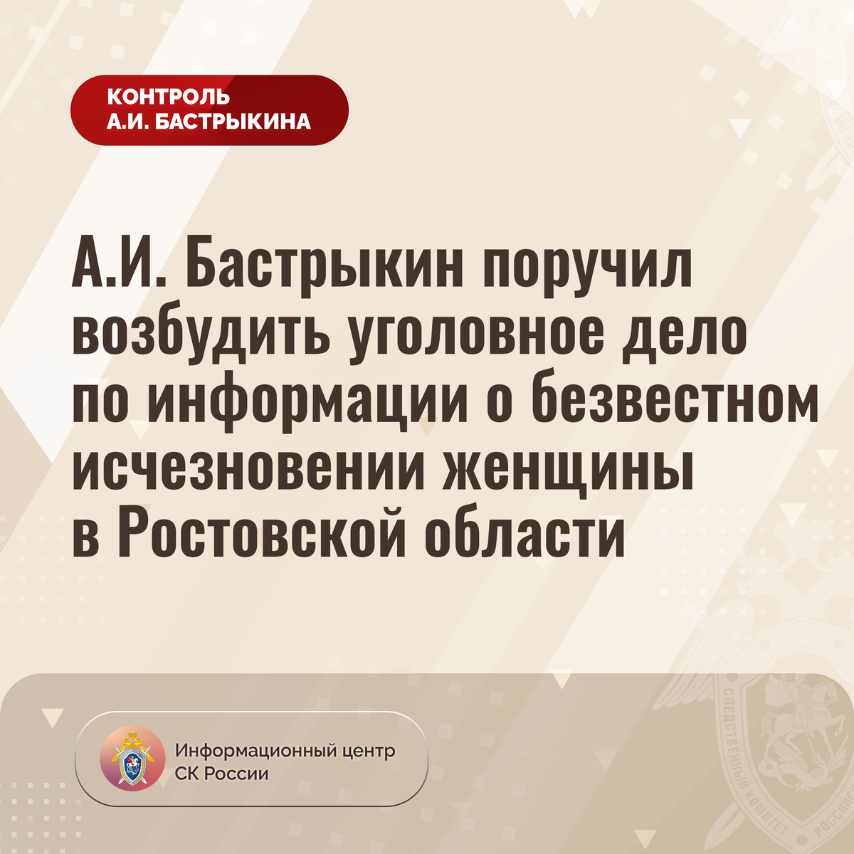 А.И. Бастрыкин поручил возбудить уголовное дело по информации о безвестном исчезновении женщины в Ростовской области