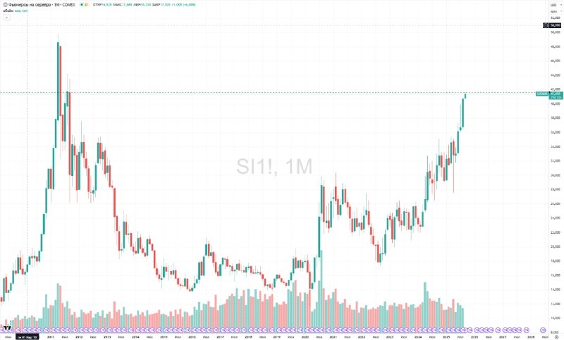 Цены на серебро подскочили до максимума за 14 лет Цены на серебро подскочили до максимума за 14 лет Фьючерсы на серебро c поставкой в декабре на бирже Comex подорожали на 2,25%, на пике достигнув $41,64 за унцию. Выше этого уровня драгоценный металл торговался в предыдущий раз почти 14 лет назад 9 сентября 2011 года. Исторический максимум цен на серебро на бирже был установлен 25 апреля 2011 года на отметке $49,82 за унцию. Золото подорожало на 1,17% и впервые в истории превысило отметку $3550 за унцию, на пике достигнув $3557,1. Драгметаллы обновили максимумы на фоне роста ожиданий снижения ставки ФРС на заседании 17 сентября. Спрос на драгоценные металлы также вырос из-за того, что неоднократная критика в адрес ФРС со стороны президента США Дональда Трампа усилила опасения по поводу потери независимости регулятора, выполняющего функции центрального банка страны. Подробнее Цены на серебро поднялись к максимуму за 14 лет Данные: TradingView (месячный график) Подписаться на «Са