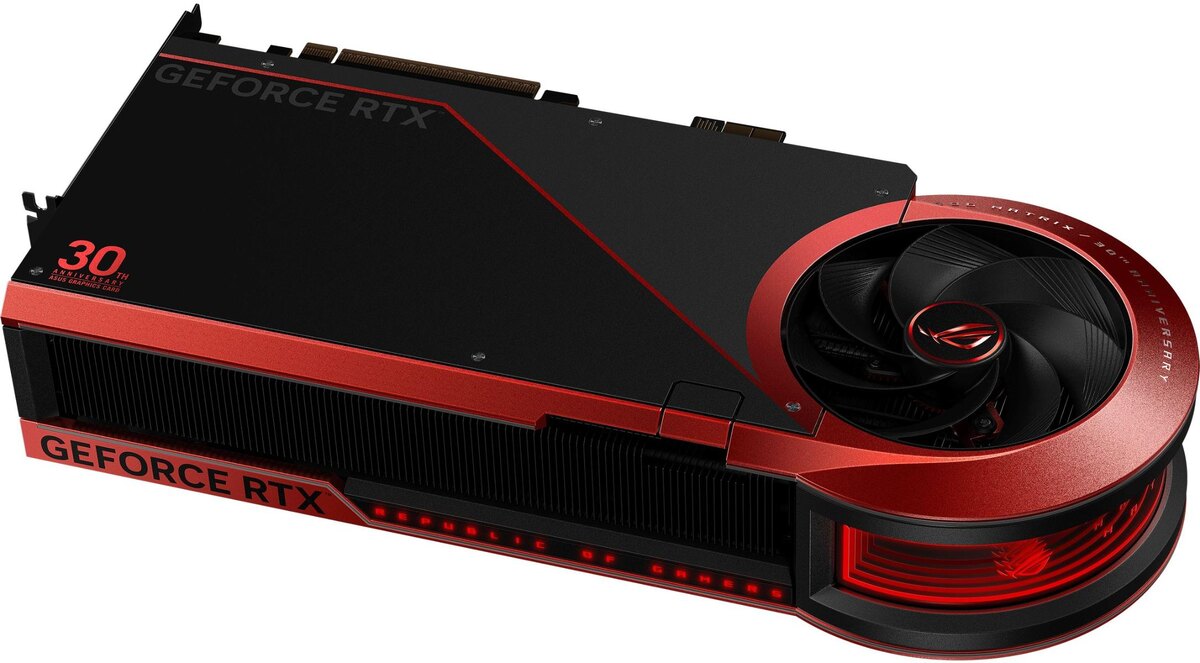 Начало продаж видеокарт ASUS ROG Matrix Platinum GeForce RTX 5090 30th Anniversary может быть запланировано на конец октября 2025 года, сообщает VideoCardz со ссылкой на информацию сингапурского подразделения компании. Неизвестно, является ли эта дата актуальной только для Сингапура или в конце октября видеокарты станут доступны глобально. Источник изображения: ASUS ASUS ROG Matrix Platinum GeForce RTX 5090 30th Anniversary была представлена на выставке Gamescom 2025 в рамках празднования 30-летия со дня выхода первой видеокарты ASUS. При разработке дизайна новинки специалисты компании вдохновлялись видеокартами EN9600 и EN9800 GT в исполнении Matrix. Это уникальная модель, которая, судя по всему, будет выпущена в ограниченном количестве. Тираж и цены пока неизвестны, но очевидно, что стоить видеокарта будет дорого. Подробно о новинке рассказывалось в прошлых новостях. Модель выполнена в культовой чёрно-красной расцветке и оснащена системой охлаждения с четырьмя вентиляторами, испарите
