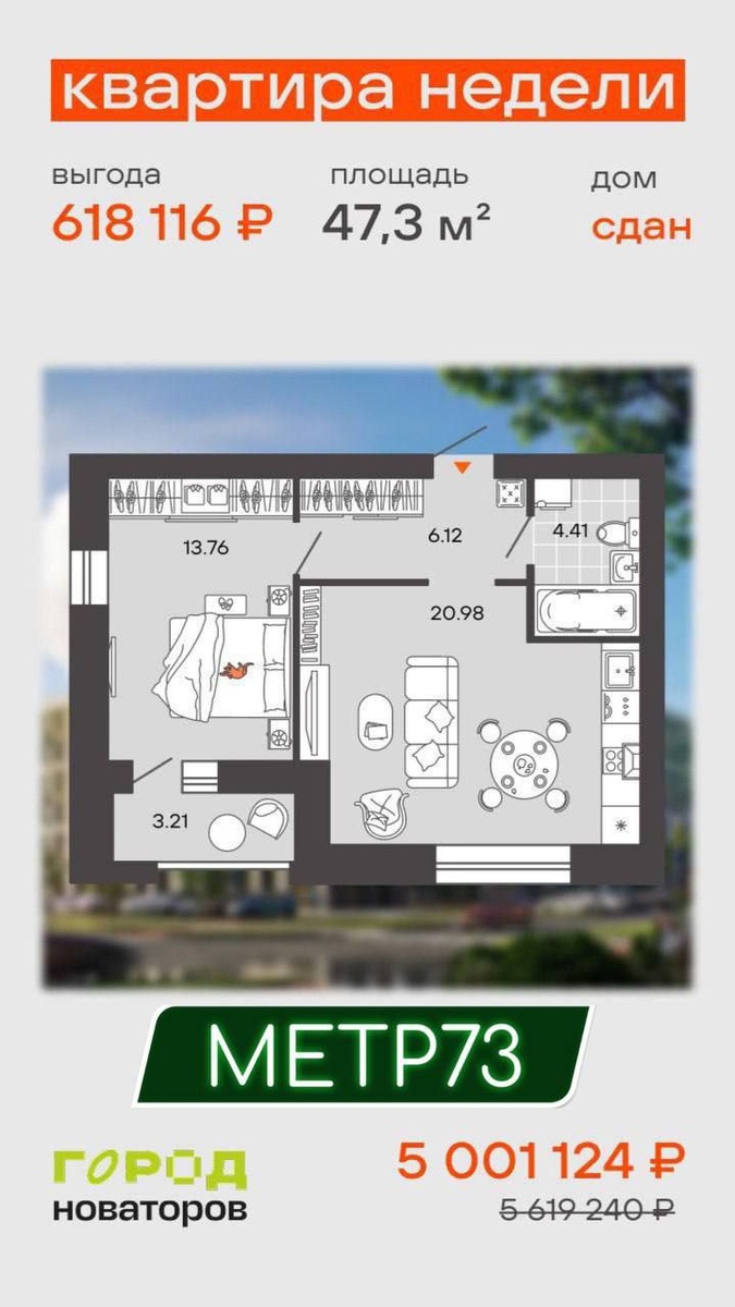 Квартира недели! Успей забронировать до 07.09.25 - Евро 2 комнатная квартира - кухня-гостиная (21 кв.м.) -прихожая с возможностью установки шкаф-купе -балкон (3,2 кв.м.) ЖК «Город новаторов» Дом сдан Номер квартиры и дом, этаж: № 182/дом 1 / 4 этаж Площадь: 47,3 кв.м. Тип отделки: Базовая Стоимость: 5 671 270 руб. ⚡️При быстром выходе на сделку предоставляется скидка до 11 %⚡️ А это значит, что экономия составит 618 116 руб. 🔥 P.S. ниже прикреплю сообщение для клиента, можете копировать и сразу отправлять в работу