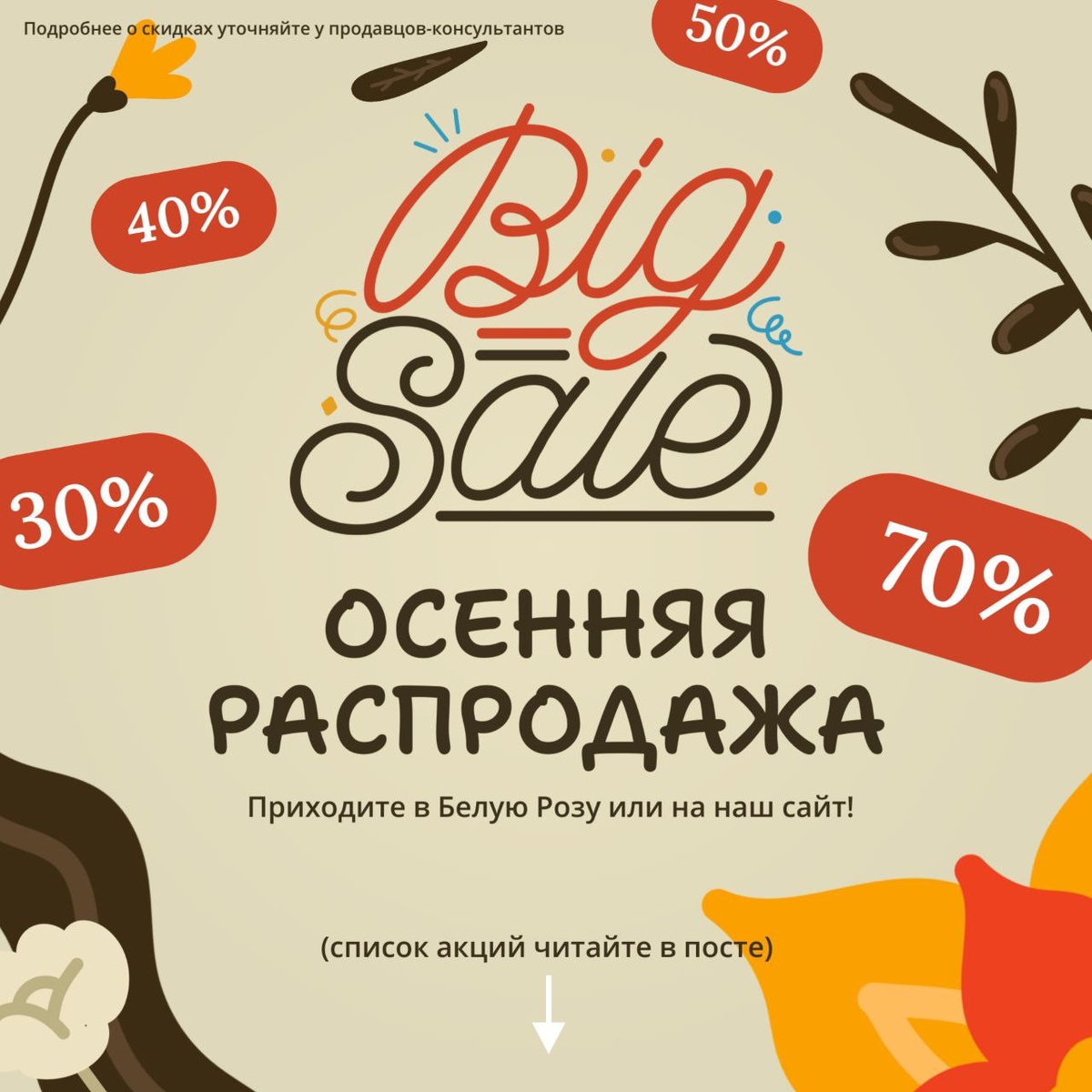 🍂1️⃣1️⃣1️⃣5️⃣1️⃣1️⃣ сентября 🍂 в «Белой Розе»! ✨ Сентябрь — время уютных покупок по суперценам! 💛 Мы обновили список акций, и только для покупателей в Томске доступны невероятные скидки: 📌 01–30 сентября 2025 г. –70% / –50% — Флористика (кроме фоамирана) –50% — Заготовки: дерево, гипс, керамика, пластик, пенопласт –20% — Алмазная вышивка, картины по номерам –70% — Декупаж (бумага для декопатча, рисовая бумага, салфетки, карты) –70% / –50% — Фурнитура для шкатулок и заготовок –70% / –50% — Мыловарение –50% — Лента атласная –40% — Нитки 3000я арт. 1405 (WR) 6 руб. — Молния х/б 20 см, арт. 1786 6 руб. — Молния полупотайная, арт. 1684 –70% — Перчатки –50% — БОА –20% — Цепь декоративная –30% — Бахрома декоративная –60% — Карнизы –40% до –60% — Ткани костюмно-плательные –30% / –50% — Портьеры (витринные образцы) Осень — самое время обновить коллекции и творить красиво 🍁 👉 Успейте до 30 сентября! Наш сайт📲