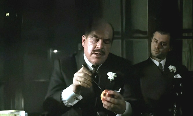 Вся сцена поставлена, как пародия на "Крестного отца", а герои носят фамилии знаменитых голливудских режиссеров - Альфредо Скорцезе, Франко Де Ниро. А самого босса мафии зовут Биг Джим Чимино.