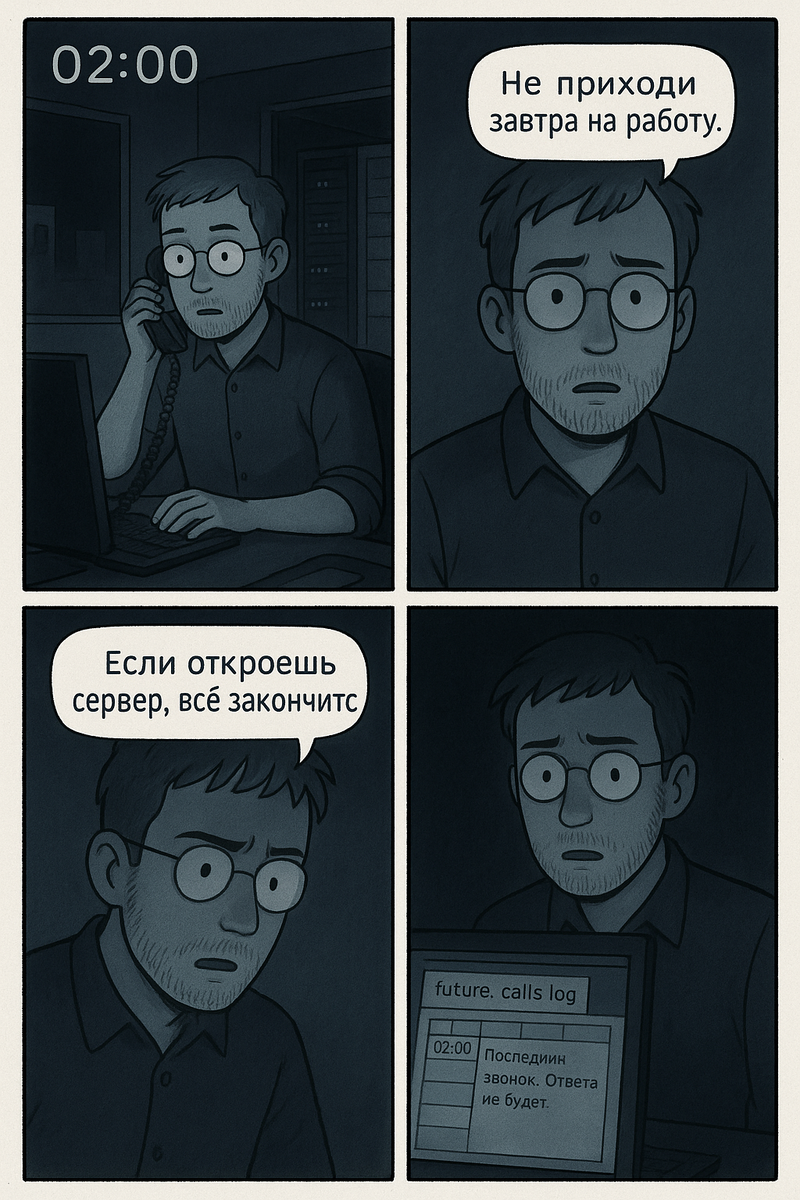 Я всегда любил дежурить ночами в офисе: никого нет, интернет летает, можно спокойно ковыряться в системах. В те годы я отвечал за внутреннюю телефонию — у нас была своя АТС, и любые звонки проходили через сервер, где всё логировалось. Обычно ночью телефон молчал. Максимум — редкие звонки от охраны. Поэтому, когда ровно в 02:00 зазвонил мой рабочий аппарат, я удивился. На дисплее высветился мой собственный внутренний номер. Я поднял трубку. Несколько секунд тишины. А потом я услышал… свой собственный голос. Глухой, искажённый помехами, но безошибочно узнаваемый. — Не приходи завтра на работу. Я замер. Попробовал что-то спросить, но связь оборвалась. Первым делом я проверил логи звонков. Да, входящий был с моего же номера. Но система показывала, что звонок пришёл не изнутри офиса, а… с внешней линии. Номер выглядел так, будто его сгенерировал кто-то вручную: «000000». Я не нашёл этому объяснения. Утром рассказал коллеге, он отшутился: мол, перегрелся. Но на следующий день я заметил стра