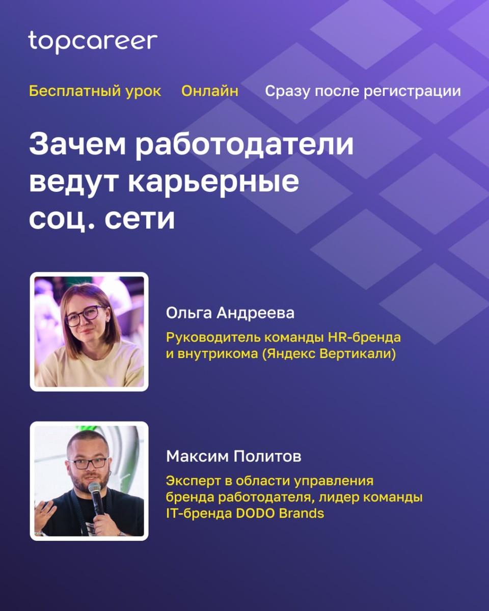 🪡 Почему сильный бренд работодателя — это замеряемые результаты, которые ощущают и HR, и бизнес? 🪡 Что такое карьерный SMM и зачем он нужен? 🪡 Какие площадки работают — и как выбрать свою? 🪡 Какие компании уже успели успешно внедрить карьерные SMM? ➡️ Об этом и многом другом рассказываем на нашем бесплатном уроке «Зачем работодатели ведут карьерные соц. сети», который доступен сразу после регистрации! ПОЧЕМУ ВАМ НУЖНО ПОСМОТРЕТЬ ЭТОТ УРОК? Своими инсайтами и экспертизой поделятся топовые эксперты в области HR-бренда: ⭐️ Максим Политов, Лидер команды IT-бренда в Dodo-brands, консультант по корпоративным коммуникациям ✨ 10 лет в HR-маркетинге, EVP и внутрикоме. Более 250 проектов для ключевых работодателей (Danone, Сбер, ВТБ, Альфа-Банк, Авито, beeline и др.). ✨ Развивал бренд работодателя для офисных, IT и массовых позиций, курировал технический бренд Raiffeisen Digital, трансформацию культуры в Авито. ✨ Организатор South HUB и преподаватель с 5+ годами опыта. Экспертиза: брен
