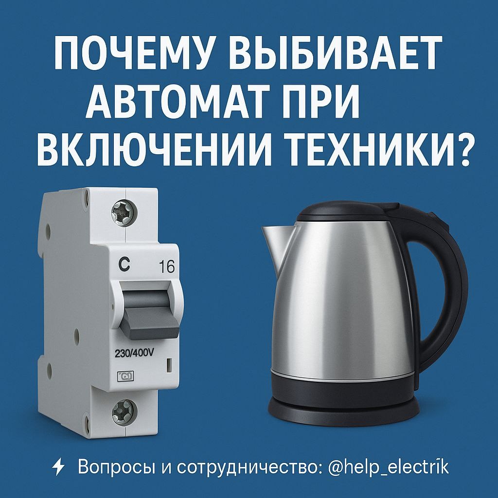 Почему выбивает автомат при включении техники? Автомат срабатывает при включении прибора — что это значит? Основные причины: 1️⃣ Перегрузка линии — техника слишком мощная для этой группы (чайник + микроволновка + обогреватель). 2️⃣ Высокий пусковой ток — холодильники, кондиционеры, насосы при старте «берут» в разы больше. 3️⃣ Неисправный прибор — внутри может быть короткое замыкание. 4️⃣ Неправильно подобран автомат — слишком маленький номинал. ✅ Что делать: Разделить нагрузку по разным линиям. Проверить приборы. Подобрать автомат под кабель и нагрузку. ⚠️ Главное: автомат выбивает не просто так — это сигнал о проблеме. --- ⚡ Вопросы и сотрудничество: @help_electrik