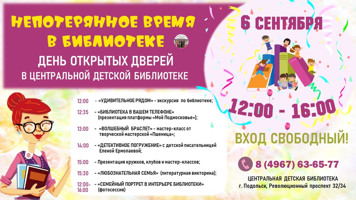 ✨ НЕПОТЕРЯННОЕ ВРЕМЯ В БИБЛИОТЕКЕ. День открытых дверей 👉Забудьте все, что вы знали о библиотеках! Мы не просто храним книги, мы открываем порталы в другие миры, создаем волшебные артефакты и знаем очень много тайн и секретов! 💜Хотите с нами познакомиться? Ждем вас на ДНЕ ОТКРЫТЫХ ДВЕРЕЙ Центральной детской библиотеки! 📖Слышишь? Это – тихий шепот страниц, зовущих тебя в приключения! 🚫 Возраст: 6+ 📆 06.09.2025 🕒 12:00 🏢 Центральная детская библиотека 📍 г. Подольск, Революционный проспект д. 32/34 💰 Вход свободный❗️ ⭐Поддержать канал голосом 💰 Вакансия - курьер в Подольске ✅ Мероприятия Подольск https://dzen.ru/id/66ed500f7b5671493eca3fd6 http://vk.com/podolsk_events http://dzen.ru/podolsk_events